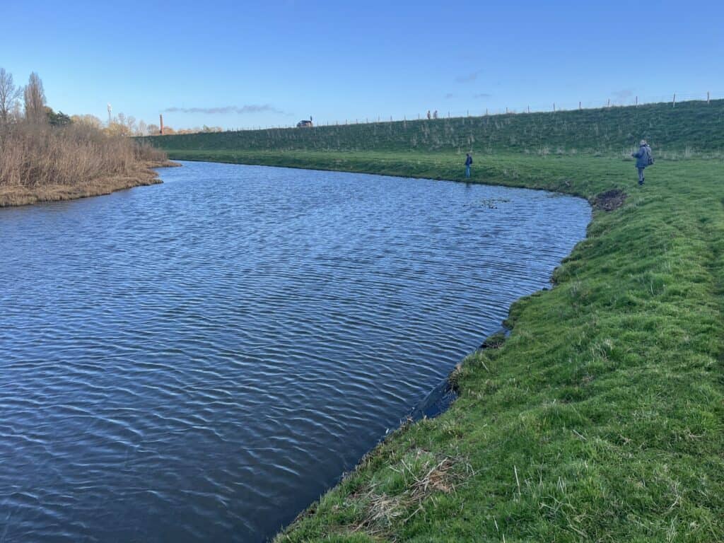 Wanneer we bij de eerste stek arriveren staat de zon al hoog aan de hemel. Er staat een bijtende wind, maar achter de dijk staan we precies uit de wind en in de zon. Best lekker! We nemen onderling een meter of honderd afstand, en vissen de sloot zorgvuldig af. Ik gooi het stuk water waar ik sta in een waaierpatroon uit, zodat ik elke vierkante meter van de stek afvis, en verplaats dan weer een stukje verder om die procedure te herhalen. Sander en Richard doen op hun plekken hetzelfde, maar enige actie blijft vooralsnog uit. Toch staat Richard na een poosje ineens met een kromme hengel in zijn handen: een mooie snoek heeft zijn Savage Gear Roach in de kleine maat gegrepen, en brengt ons zo van de nul af! De moed zit er gelijk in, dus fanatiek vissen we verder. Het zou op deze stek echter de enige aanbeet blijken. Tijd dus om te verkassen, want er is hier water genoeg om uit te kiezen!