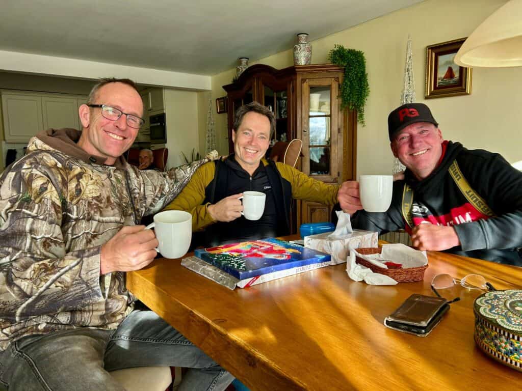 Wanneer ik s’ochtends vroeg op een lege A6 in de stromende regen door het deprimerende Flevolandse ‘landschap’ rij, een groene woestijn vol met lelijke windmolens, vraag ik me af of het wel goed gaat komen vandaag met het vissen. De stortregen geselt mijn voorruit, en de ruitenwissers moeten in de hoogste stand om nog enig zicht op de weg te houden. Maar wanneer ik vanuit Lelystad de Houtribdijk naar Enkhuizen op draai, breekt de bewolking ineens open, en stopt de regen als bij toverslag! De timing had niet beter gekund, want vandaag staat een dagje op de rol waar ik al een tijd naar uitkijk: samen met mijn goede vrienden Sander Muller en Richard Hoff gaan we ons weer onderdompelen in onze jeugdjaren, toen het vissen nog zo eenvoudig was! Niks geen Livescope en lithiumaccu’s, maar een spinhengel, een tasje met kunstaas en een paar stevige laarzen om de Noord-Hollandse klei te trotseren. Richard is vandaag ook jarig, en om dat te vieren houden we bij Sander thuis allereerst een uitgebreid verjaardagsontbijt!