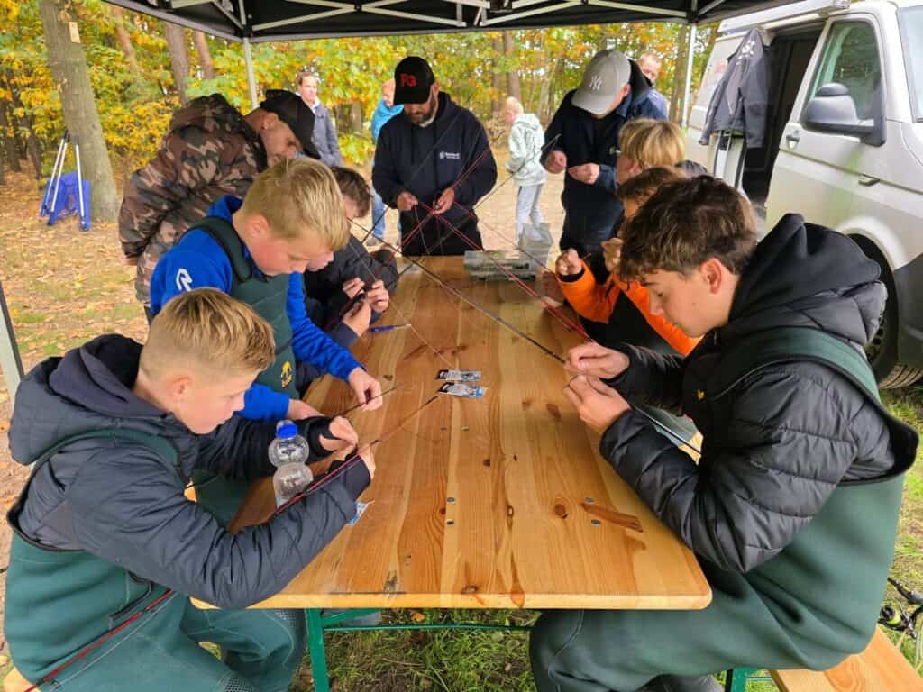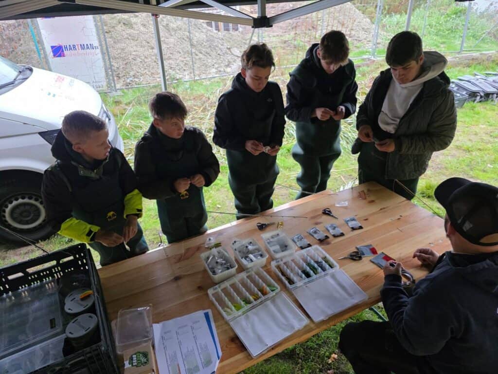 Aangezien we als begeleiders niet weten wat het niveau van onze deelnemers is, starten we met een korte introductie met video’s. Daarna krijgen de jongens een lesje in het leggen van de halve bloedknoop; toch één van de makkelijkste en meest betrouwbare knopen die er is. Daarna krijgen ze ook nog een prachtige onthaaktang, aangeboden door Predatorgear! Het lesje knopen blijkt niet echt nodig: deze jongens kennen dit soort knopen al lang, en ook het werpen en binnenvissen kent eigenlijk geen geheimen voor ze. We besluiten het programma dan ook ter plekke aan te passen aan de in de groep aanwezige kennis: we skippen het ‘kantprogramma’ met uitleg, en gaan meteen met de jongens in de bellyboten het water op om te vissen. Zo halen we het maximale uit de visdag! Snel gaan we te water, en slepen we de jongens naar de verschillende visstekken.