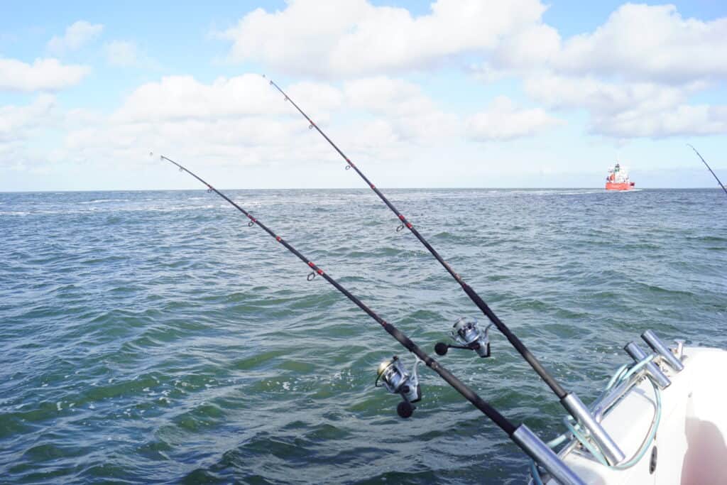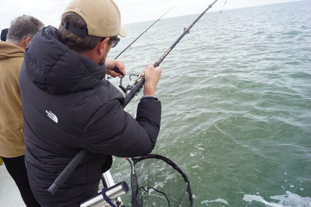 Helaas duurt dit feest niet heel lang, want op een gegeven moment vallen de aanbeten helaas weer stil. Jacco maakt ondertussen een nieuw strijdplan. Eerst eten we onder het vissen nog even een lekker hamburgertje dat Jacco in het kombuis heeft klaargemaakt voor ons, en daarna pakken we de boel weer in, en keren we terug naar de eerste stek van de dag. Dit is immers de stek waar meestal de grootste haaien vanaf komen, en aangezien iedereen inmiddels qua vangsten aan zijn trekken is gekomen besluiten we alles op alles te zetten voor die meterplus vissen! We peuzelen lekker ons broodje op, halen de hengels weer binnen en het anker wordt weer gelicht. Het is inmiddels alweer twee uur in de middag, dus die laatste anderhalf uur gaan we ons volledig op die stek focussen! De twee Toyota-motoren brengen ons weer in volle vaart terug naar de Westerschelde, en eenmaal gearriveerd op de stek zetten we de lijnen voor de laatste keer uit. Het is inmiddels volop opkomend tij, en doordat de boot nu andersom in de stroming ligt kunnen we volop genieten van het middagzonnetje in de luwte van de stuurhut. Heerlijk! Maar waar blijft de vis? De toppen blijven weer akelig stil..