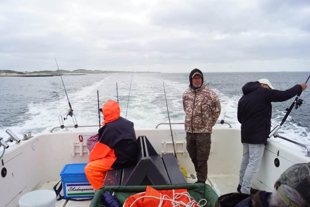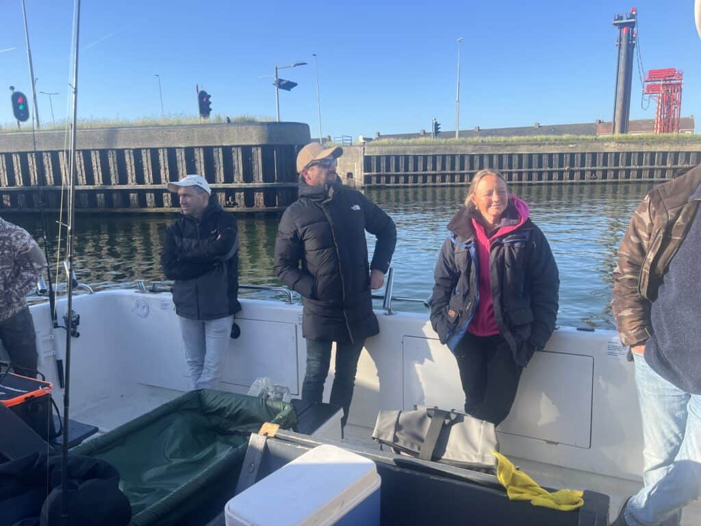 Na een lange rit naar het Zeeuwse Vlissingen arriveer ik mooi op tijd bij de ligplek van de Waypoint, en tref ik kapitein Jacco in t-shirt en korte broek. Dat vind ik op het moment een uiterst ambitieuze garderobe, want in tegenstelling tot de rest van de week is er nu sprake van een behoorlijk koude ochtend! Voor ik vertrok twijfelde ik nog even of ik naast mijn fleecejack ook nog mijn Viswereld-softshelljasje zou aantrekken, en ik besloot dat te wél te doen, omdat dat leuk staat op de foto’s. Achteraf ben ik daar verdomd blij mee! Snel gooien we de trossen los, en varen we naar de sluis waar de gasten op ons staan te wachten. We helpen iedereen snel aan boord, en varen dan samen met nog wat charterboten snel de sluis in. Op naar het open water, op naar de Noordzee! Eenmaal buitengaats vliegt de harde, koude noordwestenwind ons om de oren, en staat er een behoorlijke golfslag! Het is immers afgaand tij, en de wind staat precies dwars over de harde stroming! We kruipen allemaal bij elkaar achter de stuurhut van de Waypoint om maar die vieze koude wind te ontlopen, en zetten volgas koers naar de eerste stek!