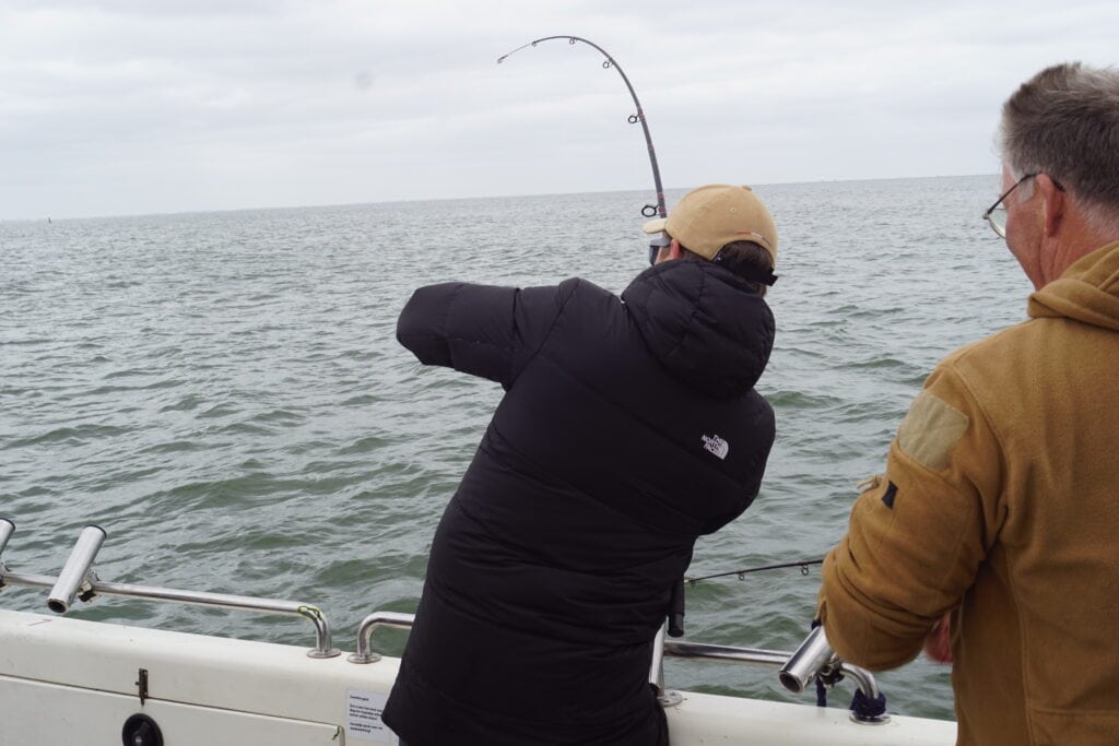 Na een uurtje hier hebben we het wel gezien op deze stek, en gaan we op zoek naar betere visgronden. Een extra moeilijkheidsfactor is dat deze haaien zó dicht bij de bodem zwemmen, dat ze op het sonarscherm niet zichtbaar zijn. Het is dus altijd gissen of ze er überhaupt zitten. We schuiven een stek op, en laten het anker weer zakken. De lijnen gaan weer ‘uptide’ uit, en weer wachten we vol spanning af wat gaat komen. Maar weer blijft het stil.. Ondertussen merken we goed dat het tij begint te draaien. De boot begint steeds meer te draaien op het anker, en ik herinner me nog goed hoe we vorig jaar alle haaien vingen tijdens het opkomende tij. Zou dat nu ook misschien het geval zijn? Het antwoord liet niet lang op zich wachten! De golfslag wordt door het draaien van de stroming steeds minder, en Jacco besluit de Westerschelde te verlaten, en de volle zee op te gaan zoeken. Langs de Zeeuwse kust varen we het dorp Westkapelle voorbij, en dat is letterlijk het eind van de wereld! Hierna zien we alleen nog maar zee, zover het oog reikt! Na een poosje de oneindige zee te zijn opgevaren mindert de Waypoint vaart, en snel laat Johanna het anker weer zakken. Ook hier blijkt weer een mooie diepe kuil te zitten, wat vaak een hotspot voor deze soort is. De hengels gaan weer uit, en we worden getrakteerd op een heerlijk kippensoepje. Dat gaat er prima in op deze waterkoude ochtend! Ter plekke worden we geconfronteerd met weer een nieuwe tegenslag: de stek hier zit vol met wier en algen, dat zich snel op onze lijnen ophoopt. De moed zakt ons nu echt in de schoenen.. We naderen inmiddels al het middaguur, en we hebben nog geen haai gezien. Maar dat zou méér dan goed komen!