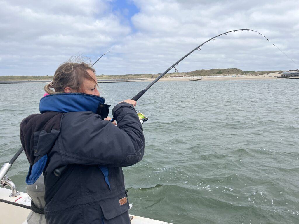 Terwijl we wachten wachten slaat de vertwijfeling weer toe. Hadden we niet beter op de vorige stek kunnen blijven, ondanks dat de beet eruit ging? Maar goed: we wilden grotere vissen vangen, dus alles of niets op deze stek! En uiteindelijk worden we beloond! Het is de hengel van Jacco zelf die krom slaat, en na een prachtige dril komt er een prachtige haai van boven de meter in de cradle! Hier kwamen we voor! En even later staat ook Mirjam hard te drillen met een flink exemplaar! We hebben duidelijk de grotere vissen gevonden, want de formaten die hier aan boord komen zijn duidelijk een stuk beter dan op de verre stek! In de tussentijd heb ik me vooral beziggehouden met fotograferen en het landen van de vissen van de andere deelnemers, maar wanneer er weer een hengel afgaat wordt deze dril aan mij gegund. Zo mag ik ook nog even lekker pompen! Het maakt de feestvreugde compleet, en voldaan besluiten we om half vier lekker terug naar de haven te varen. We hebben volop haai gevangen en het is mooi geweest. De zilte zeelucht heeft ons rozig gemaakt, en we moeten allemaal nog een flink stuk rijden. Het anker wordt gelicht en rustig zetten we weer koers naar de sluis. Bij de sluis nemen we hartelijk afscheid, en gaan ieder weer ons weegs. Het was een prachtige dag!