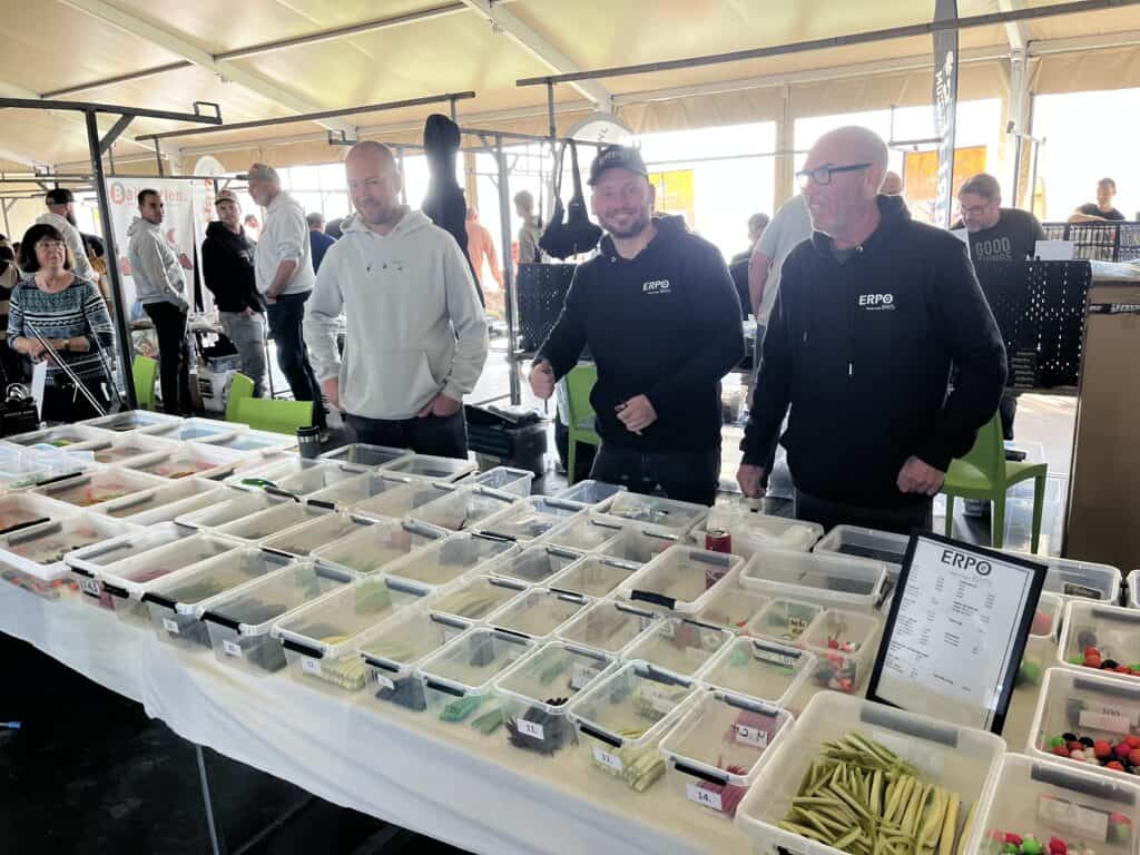 Ik loop door, en kom op de stand van Erpo Baits, waar Nick van Erpo en Ed Brands hun volledige assortiment hebben uitgestald. Natuurlijk heel veel keuze voor het vissen op snoek en snoekbaars, maar ik ben natuurlijk vooral geïnteresseerd in de nieuwe, grote paddletail van 27 centimeter voor de meervalvisserij! Ik krijg er één in handen gedrukt om uit te proberen, en reken maar dat deze binnenkort extreem aan de tand gaat worden gevoeld! Er staat namelijk een leuk tripje op de rol deze week..
