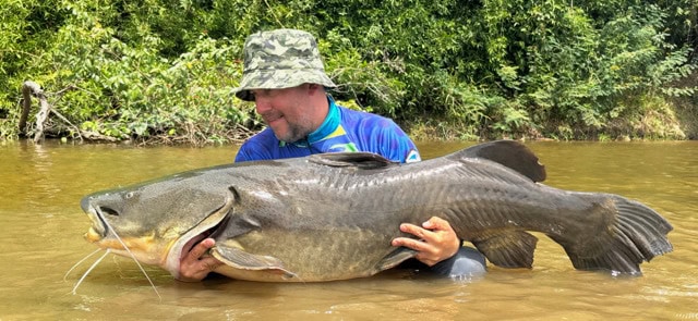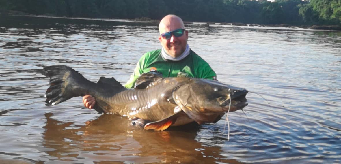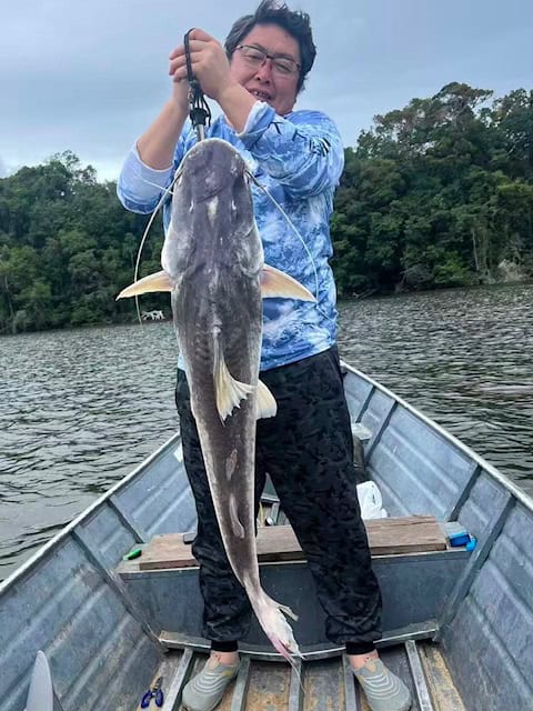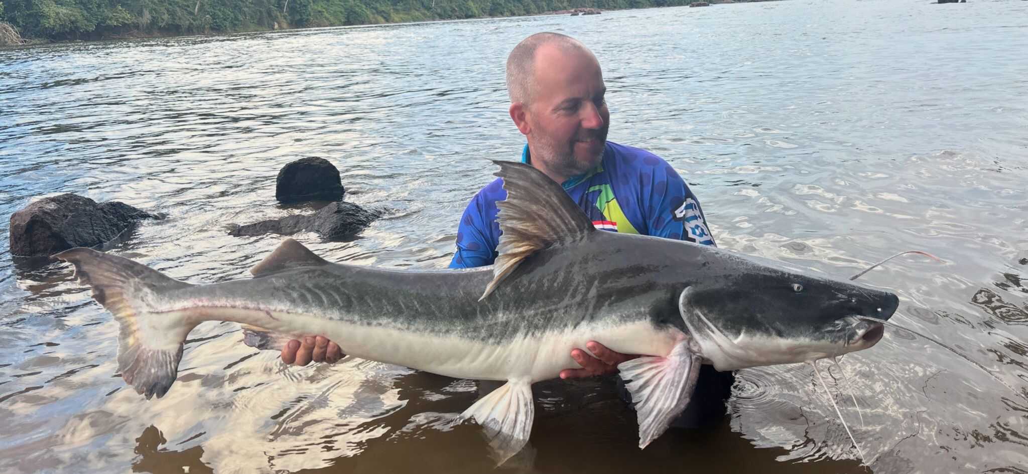 Laatste dag alweer, en iedereen had al vele mooie vangsten binnen. Zo had het koppel dat plannen had om te gaan wandelen in de jungle, en foto’s te gaan maken hun vakantie totaal omgegooid. Het was tóch een visvakantie geworden voor beide. Na de eerste vis is de hengel niet meer weg te denken, en hebben ze zelf elke dag nog mooie vissen weten te vangen waaronder een mooie arapaima! Mijn zoektocht naar een piraiba was echter nog niet voltooid. Na een dag flink vissen en verschillende meervallen vangen, leek het erop dat ik mijn doel weer moet bijstellen naar een volgende sessie. Het was alweer vier uur op de laatste dag, en het begon ook hard te regenen. De visspullen droog weggezet, en verder gewacht. Een korte aanbeet volgde, maar stopte.. Vervolgens was het kwart voor vijf, en ik zei tegen de kapitein dat we over 25 min terug gaan om het varen in het donker te voorkomen. Ik zet het alarm van mijn telefoon om te voorkomen dat we te laat zouden zijn, zo zou ik nog wat kunnen opruimen in daglicht . Amper tien minuten later volgt een harde aanbeet en harde run op de zelfde hengel! Ik pak de hengel op en voel dat dit een serieuze vis is! De hengels stonden aan wal, en de kapitein pakte de boot en pikte me op om boven de vis te komen, zodat de lijn niet kapot kon schuren op de rotsen. Want deze bleken hier wel te liggen onder water. De laatste aanbeet van de trip was een flink gevecht! Uiteindelijk kwam de vis naar de oppervlakte, en het was een piraiba catfish van zo’n 40 pond! De vis waar we de hele week al achteraan zaten! Dit maakte de trip overcompleet , want het grootste doel was al bereikt: dat onze gasten het allemaal naar hun zin hebben gehad. Iedereen had mooie vissen gevangen, en dat hun eerste Amazon River Monster trip, maar zeker niet de laatste boven verwachting goed is verlopen! Op naar een vervolg, maar het wordt een flinke uitdaging deze succesvolle trip te overtreffen!