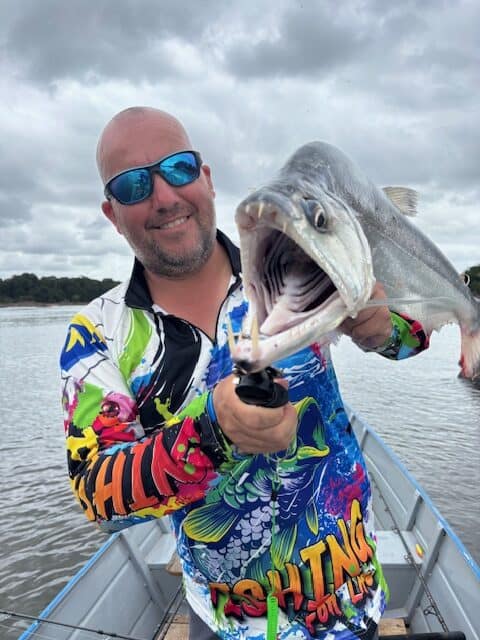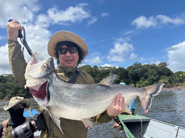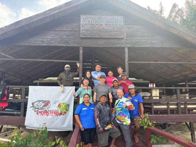 Zo gaan de dagen voorbij met vele vangsten in de groep. De lijst met de meeste voorkomende soorten is bijna helemaal afgevinkt. Dan komt de groep met de vraag waar de arapaima zich schuilhoudt. Deze vis is te vinden in lagoons, antwoordde ik. Dit werd hun volgende punt op de agenda, dus ik heb de kapiteins bij elkaar geroepen en bekeken wat de opties waren. Omdat de lagoons redelijk ver weg zijn vanuit de lodge gezien, hebben we gekozen om een jungle trip te doen met de hele groep. Geen internet, geen wc en geen stroom . Back to basic slapen in de natuur op een campingbedje en hangmat. Zo konden ze meer tijd doorbrengen in de lagoons voor een grotere kans op hun droomvis. Doordat er al een andere groep was geweest, die veel last had gehad van lijn bijtende piranha’s, heb ik deze informatie gebruikt voor wat aanpassingen in de montages, zodat de lijn niet meer kapot gebeten kan worden. Dit had meteen gewerkt, en een grote arapaima werd gevangen! Wat een bruut geweld! Het bleef helaas bij één vis. ’s Avonds met zijn allen gegeten, en op tijd naar bed om zo vroeg weer te kunnen beginnen. Tijdens dit kleine uitstapje heb ik van de gelegenheid gebruik gemaakt om in deze omgeving te vissen op meerval. Dit had meerdere mooie vissen opgeleverd: vier jau catfish waarvan zo’n 88 pond na een goed hard gevecht midden op de rivier tijdens het verticaal vissen! Hierna ving ik nog een mooie redtail catfish, meerdere grote payara’s en nog een hele flinke wolffish! En toen was het weer einde middag en op tijd terug voordat het donker wordt .