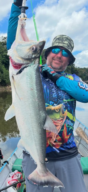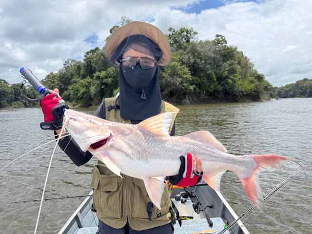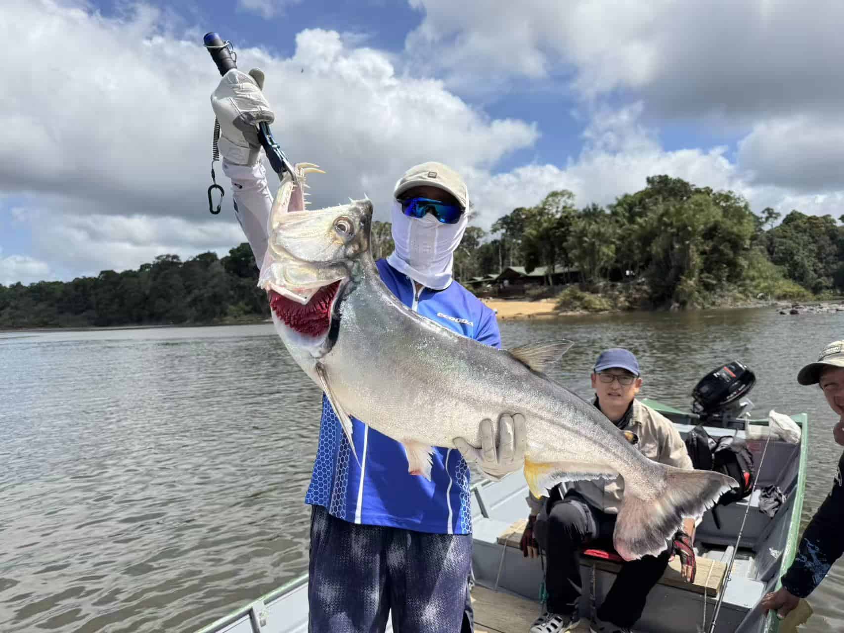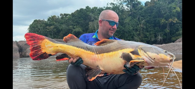 Nadat ik al een grote Payara had gevangen van 19 pond, gingen we het een stuk verder op de rivier weer proberen. Hierbij weer een aasvis aangebonden, en deze laten driften met de stroom mee aan een dobber. Na een hele harde aanbeet de vis even de gelegenheid gegeven om het aas op te eten en vervolgens aangeslagen. Mis! dacht ik.. Vis weg, maar ik kijk nog eens en zie dat mijn lijn gebroken is! Er bleek een oog van de hengel kapot te zijn, dus deze meteen verwijderd en verder gegaan. Vervolgens nog een andere meerval gevangen, en daarna terug gegaan naar het kamp. De dag erna is mijn kapitein naar het dorp gegaan om de lodge te bevoorraden, en ik ben met het koppel mee gaan vissen, zodat ze weer wat extra begeleiding krijgen om te leren vissen. Dit ging ze goed af, want tijdens het jiggen vangen ze leuke vissen! Trompetvis , drum en nog een long whiskered catfish. Als aan het einde van de ochtend mijn kapitein terug komt, kwam hij met het verhaal dat hij de dobber zag drijven die ik de dag ervoor was verloren. Toen hij deze zag, bewoog de dobber nog, kreeg hij de lijn te pakken en had deze binnen kunnen draaien met de vis er nog aan! Het bleek een Payara van 21 pond, en tevens had ik de montage weer terug. Deze montage weer opnieuw ingezet .Met een mooie redtail catfish van 56 pond als resultaat (gewichten niet gewogen maar geschat met formule)!
