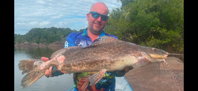 Tijdens het vissen en wachten heb ik de tijd gebruikt om wat aasvissen te vangen naast de boot als we aan de oever vast lagen. Na een harde aanbeet wist ik meteen dat het een serieuze rover was! De testhengel werd flink op de proef gesteld, en moest diep buigen! Na een minuut of vijf dacht ik dat de vis is een beetje moe gestreden was, maar het tegendeel bleek waar: een krachtsexplosie volgde, en er werd tot twee keer toe veel lijn van de molen getrokken. Vervolgens bleef de vis wat rustiger en kon ik deze binnen draaien. Het was een grote leopard Catfish, maar deze was flink te grazen genomen door een nog grotere rover! Aan de beschadigde plekken op de staart te zien, was de eerdere krachtsexplosie een aanval van een andere grote rover die het op mijn vis had voorzien!