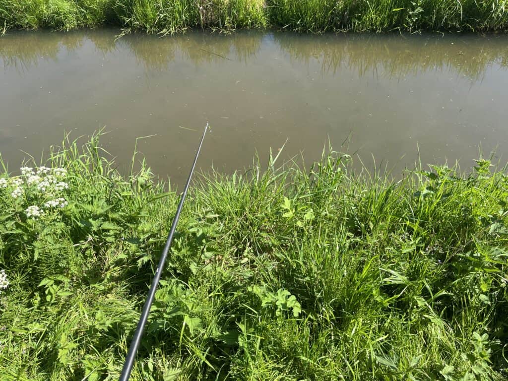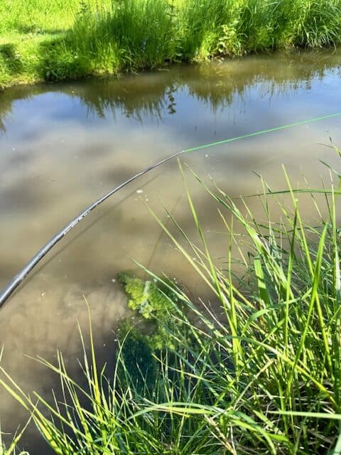 Wat doet zo’n grote vis in vredesnaam in zo’n klein slootje zal je je wellicht afvragen? Nou ja, eigenlijk is het helemaal niet zo raar: want ten eerste warmt dit extreem kleine water natuurlijk supersnel op met de huidige zomerse temperaturen, en tevens paaien ze ook in dit soort slootjes met voldoende oevervegetatie. Kortom: het is helemaal niet raar, maar ik had het gewoon écht niet verwacht! Maar nu wil ik ze vangen ook! Maar hoe? Ik ga na werktijd terug naar de plek met een zakje maden en een opgetuigde penhengel uit de winkel, maar kom er al snel achter dat dit niet de juiste aanpak is! De langs ‘cruisende’ karpers merken de pen meteen op, en zwemmen met een grote boog (voor zover dat hier mogelijk is) om mijn aangeboden montage heen. Ergens ook wel logisch natuurlijk, want in dit kleine en vooral zéér ondiepe water valt zo’n raar object in het oppervlak natuurlijk behoorlijk op! En de karpers zijn tegenwoordig ook niet gek meer.. Ik besluit de stek nog met een handjevol maden aan te voeren, en de volgende dag een andere aanpak te kiezen.