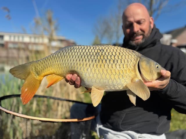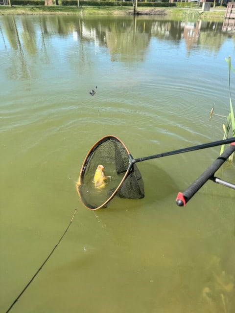 Het is inmiddels alweer een tijdje stil qua actie op de stek, dus ik varieer nog maar wat met de smaken van de popup. Het lokt verder weinig actie meer uit bij me, en ook bij William gebeurt er even weinig.. Inmiddels lopen we al aardig tegen het einde van de visdag aan, en we berusten er eigenlijk wel een beetje in dat we alle vis voor vandaag wel hebben gevangen. Toch had ik buiten de waard gerekend, want ineens zit William weer met een kromme hengel naast me! De laatste zeelt van vandaag komt op de mat, en dat levert voor William een afgetekende overwinning op vandaag! Het maakt mij verder niet uit. We hebben een heerlijk dagje in het zonnetje doorgebracht, en samen een paar schitterende vissen gevangen! En dat op nog geen tien minuten rijden vanaf huis! We pakken zoetjesaan de spulletjes weer in de auto’s, en gaan weer ons weegs. Het was weer een leuke en vooral leerzame dag!