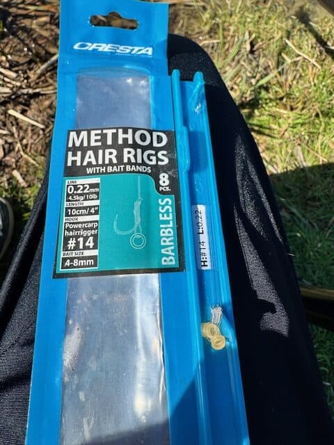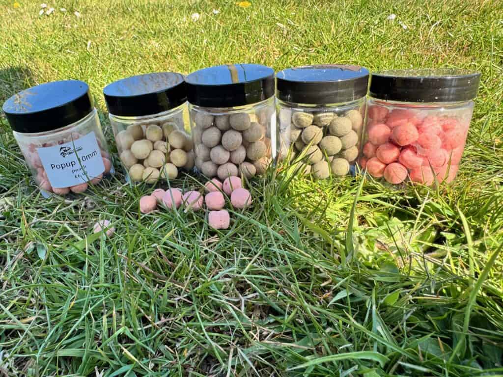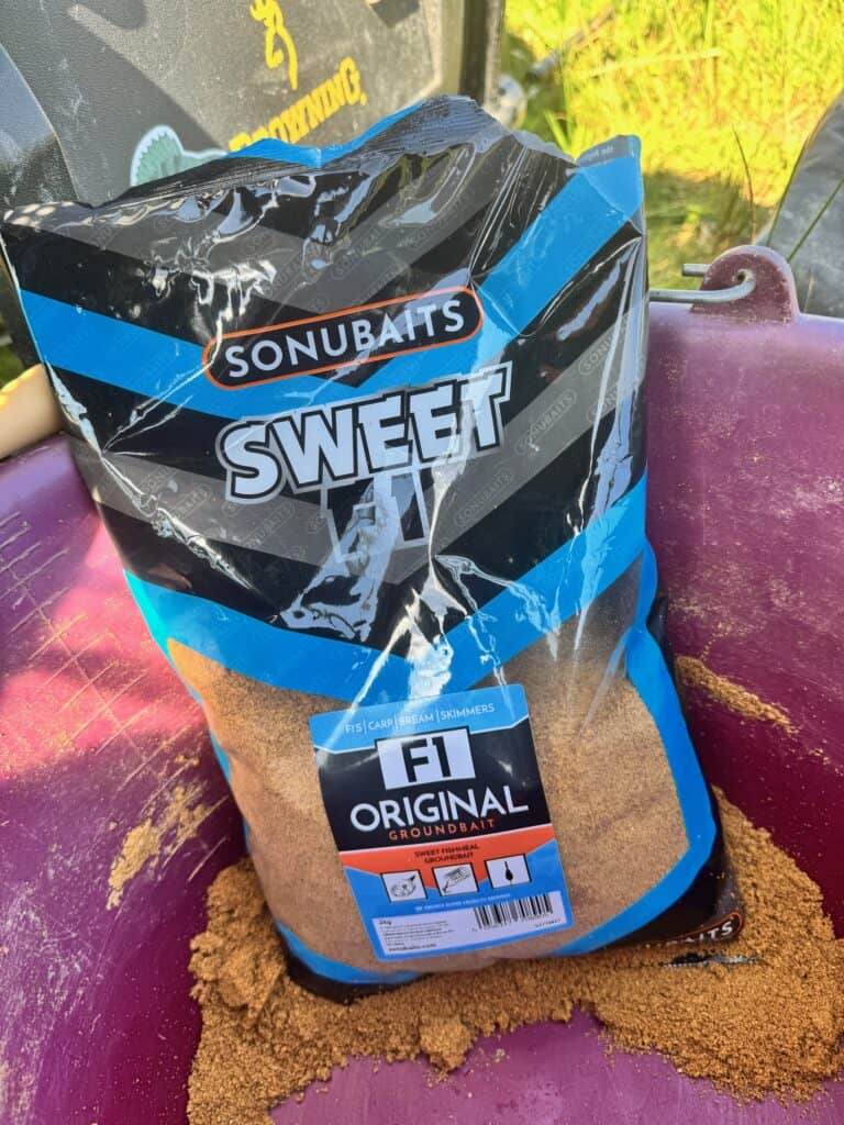 Als haakaas kon ik mooi een nieuwe popup uit ons assortiment proberen. Deze is gemaakt met heel veel melen, waardoor deze een flink drijfvermogen heeft, en is zo uit het potje te gebruiken. Zelfs wanneer deze popup al een uur in het water heeft gelegen behoudt deze zijn geur nog, en het feit dat er verder geen additieven aan zijn toegevoegd is de kers op de taart: puur natuur dus! Op de onderlijn monteren we al extra nog een klein putty-loodje om de popup echt perfect te presenteren. De bodem is hier redelijk zacht, dus we kunnen niet al te zwaar vissen. We gaan voor korfjes van 20 gram vandaag, en dat blijkt prima te werken. William schakelt na enige tijd over op een ‘gewone’ korf met schuifsysteem, omdat hij daar onder deze omstandigheden meer vertrouwen in heeft dan in de methodfeeder. Ook wisselt hij na een tijdje zonder actie naar wormen als haakaas. Vol goede moed installeren we ons aan de waterkant, voeren we onze stek aan en wachten we af wat er gaat komen! Als voer gebruiken we overigens het F1-voer van Sonubaits. Dit bevat een beetje vismeel, en dat zorgt er enerzijds voor dat het voer mooi in de methodkorf blijft plakken, en het trekt natuurlijk ook de wat grotere vissen aan.