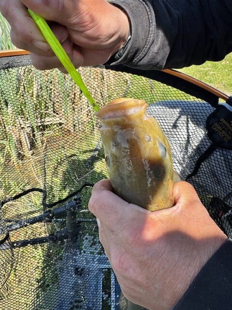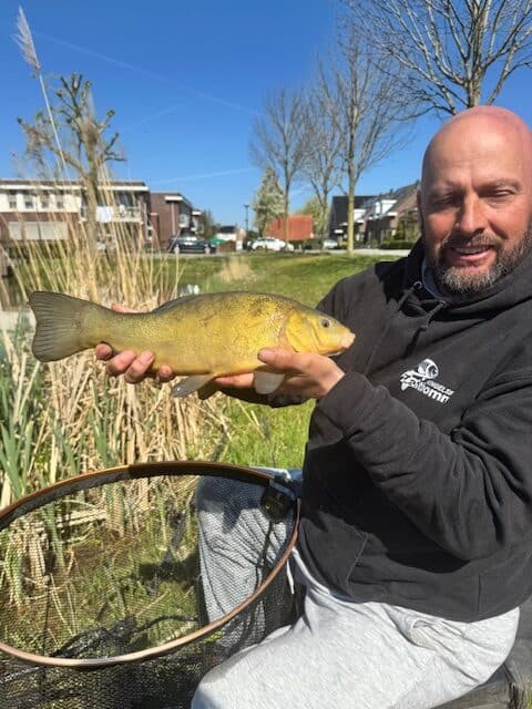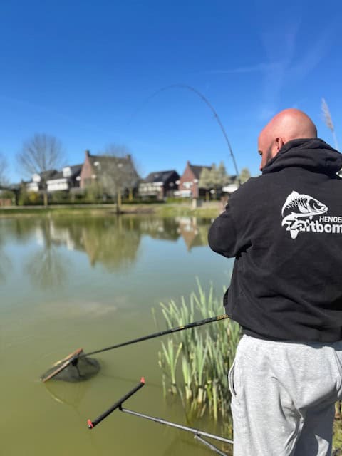 Ondertussen laten we de stek even rusten, want deze is behoorlijk verstoord door twee vangsten kort achter elkaar. Wanneer we onze korven weer te water laten blijft het dan ook een tijdje stil. Maar ineens slaat William zijn hengel weer mooi krom op een vis! Het blijkt wederom een mooie zeelt te zijn die zijn piertjes niet kon laten liggen. En zo hebben we in korte tijd toch al drie hele mooie vissen op de kant! Het laat maar zien dat je ook gewoon dicht bij huis een prima visdag kunt beleven. Wat dat betreft zijn we in dit land wel gezegend hoor! Letterlijk overal is fantastisch viswater te vinden! Ondertussen staat William wederom te drillen, en ook nu is het een zeelt die zich in het aas heeft vergist! De gewone korf lijkt vandaag dus toch beter te werken dan de methodkorf. Maar de dag is natuurlijk nog niet om! De aanbeten lijken dermate subtiel te zijn dat ze het aas snel loslaten, en met een schuifsysteem is dat natuurlijk ook beter waar te nemen.