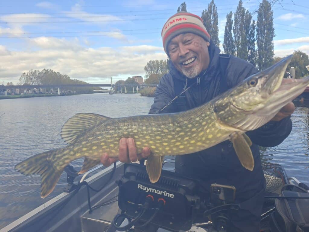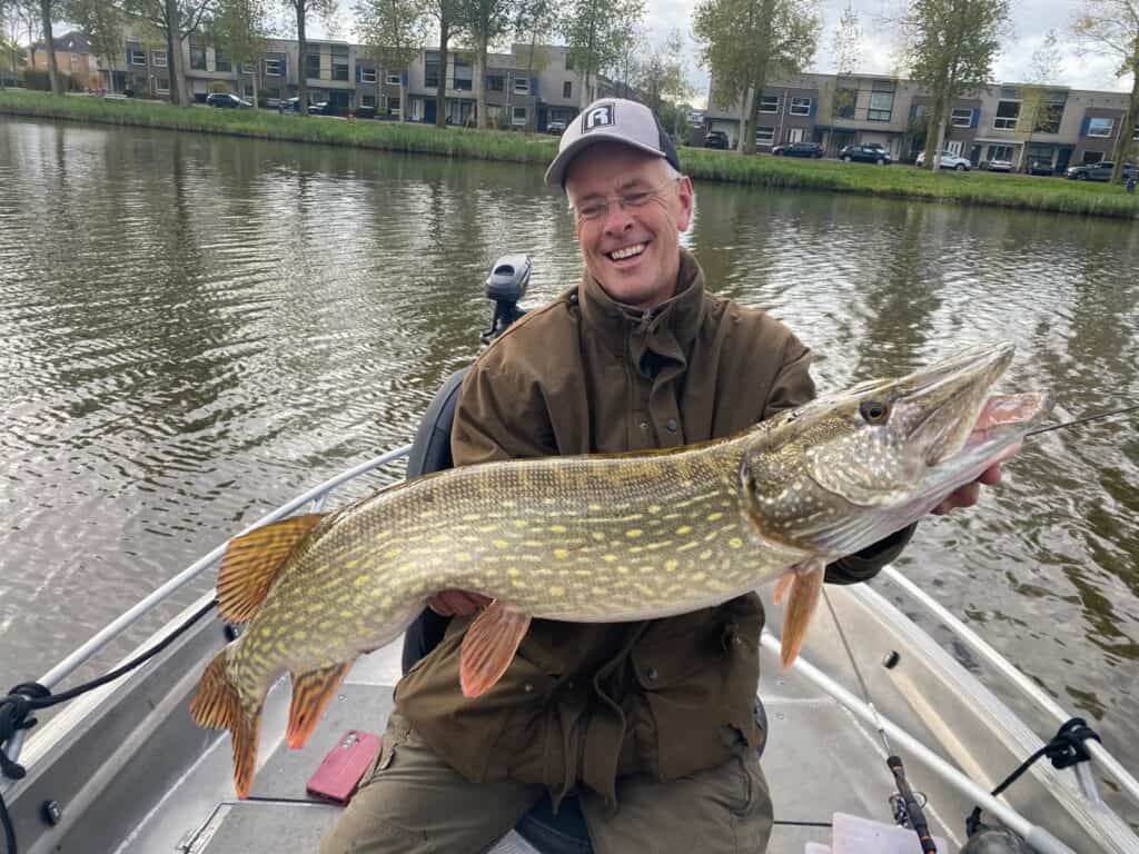 Er gaat een goed anderhalf uur voorbij waarin helemaal niets gebeurt. We nemen een broodje, wat koffie en lullen gezellig over het vissen en uiteraard over onze andere passie: de hondenafrichting. Ik kijk richting mijn dobber en besluit opnieuw in te werpen.: ‘Ik gooi even opnieuw in Leo, want het zaakje komt wel erg dicht bij onze boot’. Ik had het nog geen seconde gezegd, had mn hengel al in mijn handen of plotseling, letterlijk met een hoorbare ‘plop’ schiet de dobber weg! ‘Heb er eentje op Leo’ roep ik. Vaag zie ik een halve meter onder water de dobber staan. Ik aarzel geen moment en met een stevige tik zet ik de haak en op het zelfde moment zit ik met een erg kromme hengel in mijn handen, met aan de andere kant van de lijn een zo te voelen erg forse vis. De vis zwemt hard weg, de hengel in een verrukkelijke bocht zettend en de molenslip moet flink aan het werk. De vis neemt een dikke 15 meter lijn, en komt rustig mijn kant weer op om vervolgens te proberen om ónder de boot weg te komen en dat is nou nét niet de bedoeling. De hengel tot de helft in het water houdend zet ik stevig tegendruk. Dat kan meer dan uitstekend met dit spul. Ik ‘pomp’ de vis rustig terug. De snoek begint wat onzeker te worden en begint korte vluchten te maken zoals alle snoek doet wanneer ze een tijdje vastzitten. Rustig breng ik de vis richting oppervlak en wat ik al vermoedde klopt: het is een forse stevige snoek. Langzaam komt ze naast de boot en omdat er twee haakpunten buiten de bek hangen besluit ik de vis met de hand te landen. Als ik het net zou gebruiken bestaat het risico dat als de vis gaat rollen in het net, de haakpunten zich inhaken in het net met als gevolg uitscheuren van de bek en dat risico wil ik absoluut niet lopen. Ik wil de vis pakken maar ze ziet me en zet het nog één keer hard ‘op een lopen’, maar dat was de laatste keer. Ik schuif mijn hand achter het kieuwdeksel en til de vis op. Nog half in het water onthaak ik de vis, en til haar aan boord. Snel meten en ze is exact 1 meter! Snel een paar foto’s maken, en de vis bewonderen voor een paar seconden. Prachtig gekleurd, klokgaaf en met een zware massieve kop. Voorzichtig zet ik haar terug, en om te bewijzen hoe fit ze nog is zwemt ze met een formidabele klap met haar grote staart weg. De spetters zitten op mn bril en gezicht maar dat geeft niet. ‘Tik m af ouwe!’ roept Leo. We geven elkaar een box en gaan even rustig zitten. Foto’s bekijken en voorál nagenieten.