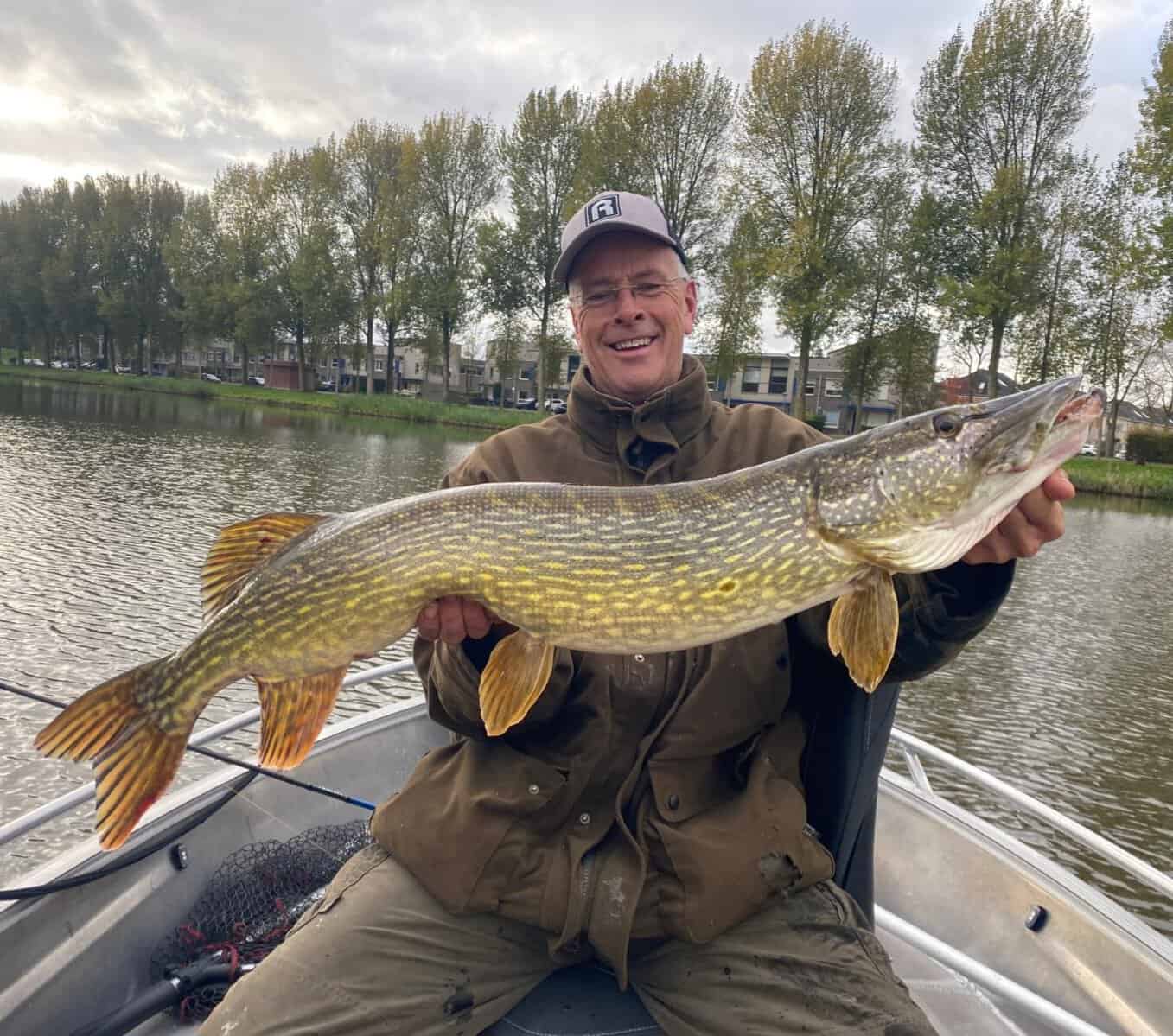 Er gaat een goed anderhalf uur voorbij waarin helemaal niets gebeurt. We nemen een broodje, wat koffie en lullen gezellig over het vissen en uiteraard over onze andere passie: de hondenafrichting. Ik kijk richting mijn dobber en besluit opnieuw in te werpen.: ‘Ik gooi even opnieuw in Leo, want het zaakje komt wel erg dicht bij onze boot’. Ik had het nog geen seconde gezegd, had mn hengel al in mijn handen of plotseling, letterlijk met een hoorbare ‘plop’ schiet de dobber weg! ‘Heb er eentje op Leo’ roep ik. Vaag zie ik een halve meter onder water de dobber staan. Ik aarzel geen moment en met een stevige tik zet ik de haak en op het zelfde moment zit ik met een erg kromme hengel in mijn handen, met aan de andere kant van de lijn een zo te voelen erg forse vis. De vis zwemt hard weg, de hengel in een verrukkelijke bocht zettend en de molenslip moet flink aan het werk. De vis neemt een dikke 15 meter lijn, en komt rustig mijn kant weer op om vervolgens te proberen om ónder de boot weg te komen en dat is nou nét niet de bedoeling. De hengel tot de helft in het water houdend zet ik stevig tegendruk. Dat kan meer dan uitstekend met dit spul. Ik ‘pomp’ de vis rustig terug. De snoek begint wat onzeker te worden en begint korte vluchten te maken zoals alle snoek doet wanneer ze een tijdje vastzitten. Rustig breng ik de vis richting oppervlak en wat ik al vermoedde klopt: het is een forse stevige snoek. Langzaam komt ze naast de boot en omdat er twee haakpunten buiten de bek hangen besluit ik de vis met de hand te landen. Als ik het net zou gebruiken bestaat het risico dat als de vis gaat rollen in het net, de haakpunten zich inhaken in het net met als gevolg uitscheuren van de bek en dat risico wil ik absoluut niet lopen. Ik wil de vis pakken maar ze ziet me en zet het nog één keer hard ‘op een lopen’, maar dat was de laatste keer. Ik schuif mijn hand achter het kieuwdeksel en til de vis op. Nog half in het water onthaak ik de vis, en til haar aan boord. Snel meten en ze is exact 1 meter! Snel een paar foto’s maken, en de vis bewonderen voor een paar seconden. Prachtig gekleurd, klokgaaf en met een zware massieve kop. Voorzichtig zet ik haar terug, en om te bewijzen hoe fit ze nog is zwemt ze met een formidabele klap met haar grote staart weg. De spetters zitten op mn bril en gezicht maar dat geeft niet. ‘Tik m af ouwe!’ roept Leo. We geven elkaar een box en gaan even rustig zitten. Foto’s bekijken en voorál nagenieten.