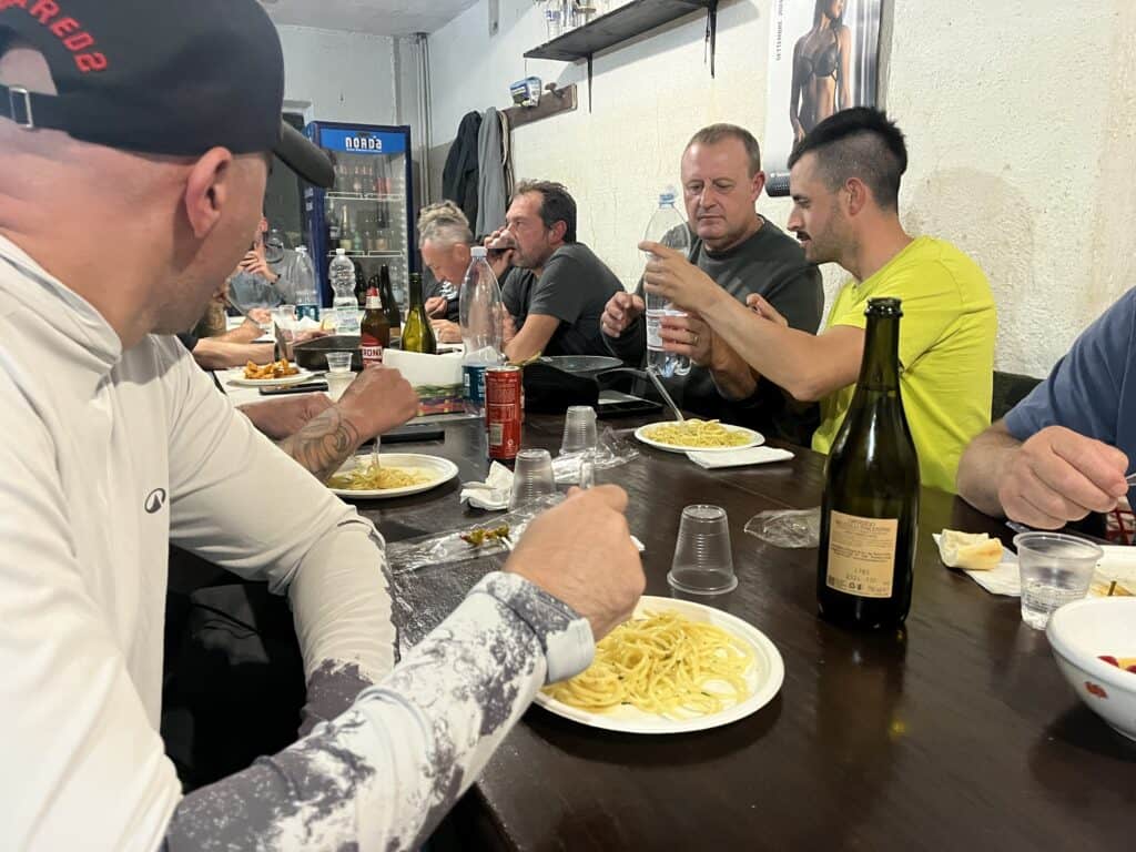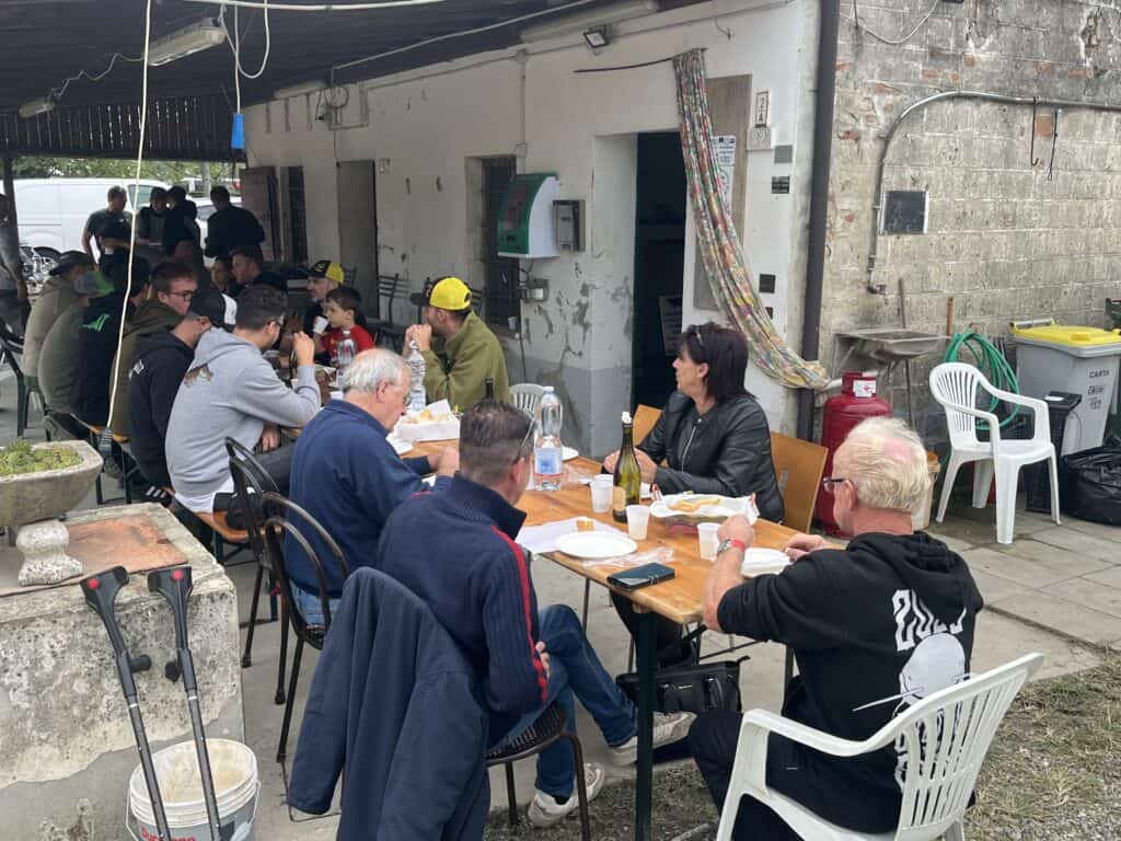 Wanneer we in het hotel onze accu’s onder stroom hebben gezet keren we terug naar de visclub. Het is er immers druk en vooral enorm gezellig! Wanneer we arriveren worden we uitgenodigd om met de clubleden mee te eten, en daar zeggen we natuurlijk geen nee tegen! Wat worden we hier geweldig ontvangen! Kosten noch moeite worden gespaard om ons een mooie tijd te bezorgen, en Matteo loopt zich de benen onder het lijf vandaan om alles geregeld te krijgen. Echt enorm indrukwekkend hoe lief en warm de mensen hier zijn! Het communiceren verloopt soms met handen en voeten, maar we begrijpen elkaar blindelings! Gepassioneerde vissers onder elkaar hebben weinig woorden nodig. Bij de overheerlijke maaltijd vloeit de wijn, en later de grappa rijkelijk, en we nemen een beslissing: we besluiten de wedstrijd te laten voor wat die is, en de geboden gastvrijheid niet af te slaan. We zouden het immers nogal onbeleefd naar onze gastheren vinden om het heerlijke eten naar binnen te proppen en dan weer in de bellyboat te springen. Als grap roepen we dat ze dit vast doen om ons van de overwinning af te houden, en dat we de bus wel open laten staan op het terrein, zodat ze de eerste prijs er alvast in kunnen zetten. Het zou een bizarre profetie blijken… De gezelligheid is er niet minder om! Tot in de kleine uurtjes eten, drinken en lachen we met de mannen, en wat is dit een onvergetelijke ervaring! Dit is het échte Italië, niet het gemaakte gedoe in de toeristische oorden. Met een propvolle maag, prachtige herinneringen en een klein stukje in de kraag hobbelen we die nacht terug naar het hotel, en maken er een volle nacht slapen van. Het zou de enige zijn deze trip..