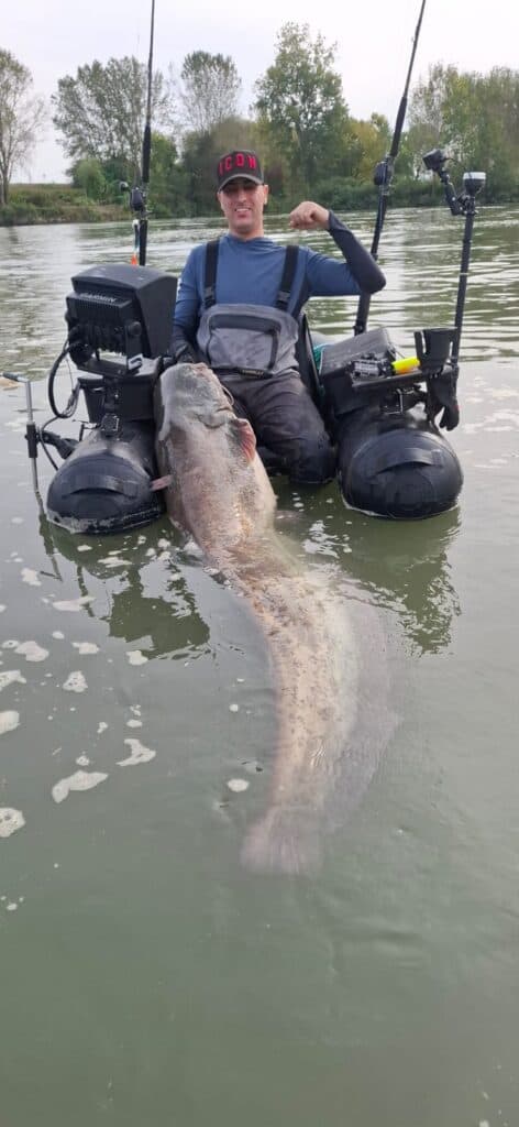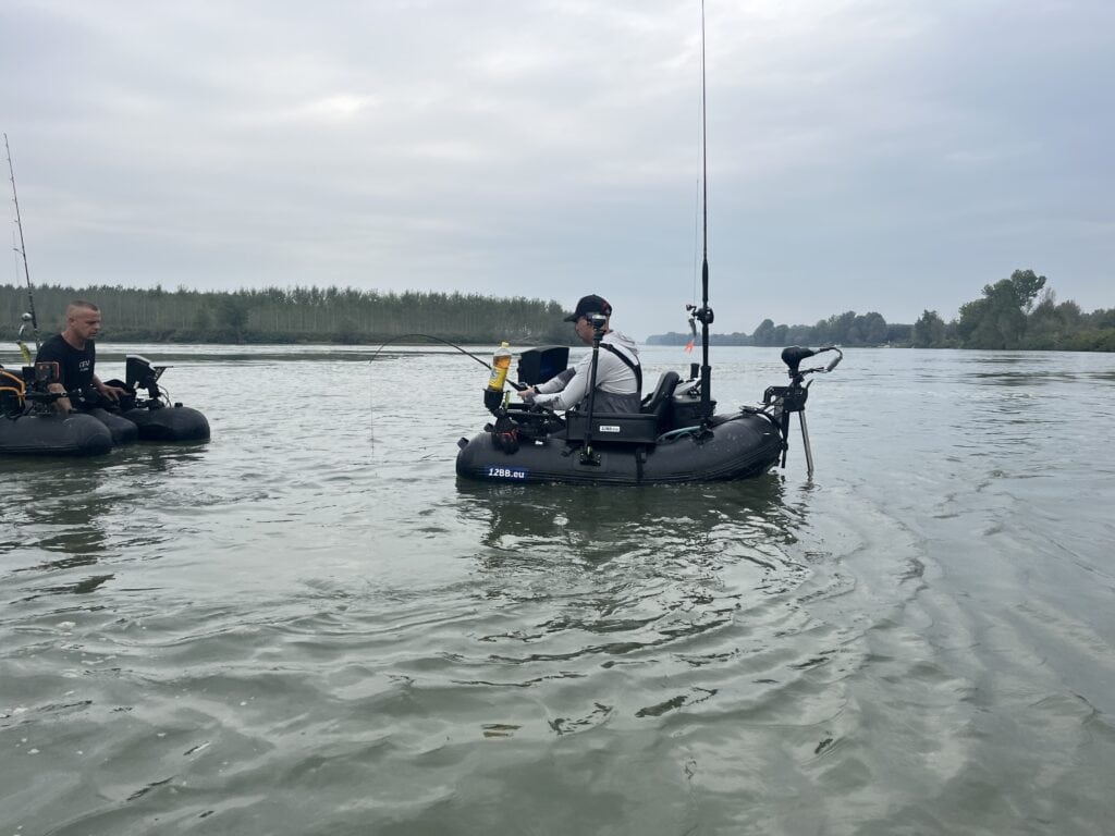 Gespannen laten we na het heerlijke eten onze boten te water, en fanatiek gaan we op zoek naar grote vissen. De wedstrijd draait immers om de grootste gevangen meerval, dus we laten het kleine grut liggen en gaan op zoek naar de formaten waar deze rivier om bekend staat. Maar de schermen blijven leeg… Er is ook amper te vissen in deze extreem harde stroming. De luwe buitenbocht met al het drijfvuil bevat slechts een paar kleine visjes, dus deze stek valt vandaag af. We besluiten terug te keren naar het verzonken bos waar Mo gisteren al succes had, en eenmaal daar gearriveerd na een worsteling tegen de stroming in gaan we tussen de vele takken op zoek naar grote vis. Maar we komen maar weinig tegen. Terwijl we zoeken en zoeken klinkt er ineens een oerkreet over het water! Het is Mo die heeft vastgeslagen op een dikke bak, en snel vliegen we naar hem toe! Mo heeft op zijn reel met 18 kilo slipkracht maar één stand, en dat is potdicht. Toch weet de vis in een enorm tempo lijn te nemen, en wil deze duidelijk terug de takken in! Mo weet de vis echter te blokken, en na een bizarre dril, waarbij Paul letterlijk met zijn bellyboat met Mo mee moet trekken om de bruut sterke meerval uit de takken te houden weet hij een werkelijk moddervette vis aan het stringertouw te krijgen! Snel varen we met de vis terug naar de opstapplek om hem te laten meten, en deze vangst is niet onopgemerkt gebleven! Alle aanwezigen drommen samen om dit monster met eigen ogen te zien, en wat een kop en pens heeft dit beest! De meting wijst uiteindelijk ‘slechts’ 219 centimeter uit, maar wat is deze vis bizar zwaar gebouwd! Het levert ons voorlopig de eerste plek in het klassement op, maar er kan natuurlijk nog veel gebeuren. De wedstrijd duurt nog tot half één de volgende middag, en de mannen die statisch aan het vissen zijn gaan natuurlijk sowieso nog de hele nacht door. Zou onze toppositie stand gaan houden? We besluiten er na een korte etens-, laad- en rustpauze weer op te gaan om de nacht door te vissen, maar daar werd op een hele leuke manier een stokje voor gestoken..