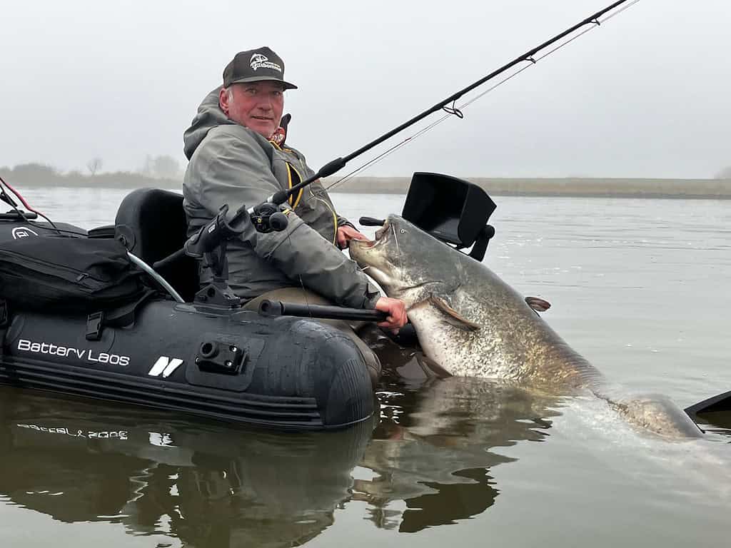 Toch zet ik me over mijn angsten heen, en kies samen met de mannen het ruime sop. Ons ‘Limburgse chapter’ AKA de Catfish Twins Bjorn en Freek zijn er vandaag niet bij. Bjorn moet werken, en Freek kiest ervoor om in zijn eentje op zijn thuiswater te gaan vissen. Via onze groepsapp houden we constant contact met elkaar. Na een paar minuten wennen voel ik me al snel comfortabel in mijn stevige Raptor in de stroming. Het stelt eigenlijk weinig voor achteraf, en al snel ga ik net als de andere jongens fanatiek op zoek naar meerval. Ik merk al snel dat het op dit water belangrijk is om ook de bodem goed af te scannen. Waar de actieve meervallen op de plassen eigenlijk altijd op half water hangen, zitten ze hier vaak stijf tegen de bodem. Ik zie een klein signaal tegen de bodem liggen, ik vis het zo goed en kwaad als het gaat aan, krijg een aanbeet en vang een meervalletje van nog geen meter. Qua formaat niks bijzonders, maar toch een memorabele vis: mijn eerste op dit nogal uitdagende water vanuit de bellyboat! Een mooie opsteker die vertrouwen geeft, en dat vertrouwen betaalt zich niet veel later uit: achter me maakt een wat groter signaal zich even los van de bodem, ik vaar snel achteruit en presenteer de shad perfect. Het resulteert in een vis van zo’n anderhalve meter. Dat gaat lekker! Het valt me ook op dat deze vis behoorlijk strijd levert voor zijn formaat. En bij het landen bijt ‘ie me ook nog eens stevig in mijn klauw! Typisch een vis van dit specifieke water: nét even sterker en feller dan hun soortgenoten op kalmere wateren. Dat gaat nog wat worden als er een écht grote aanbijt!