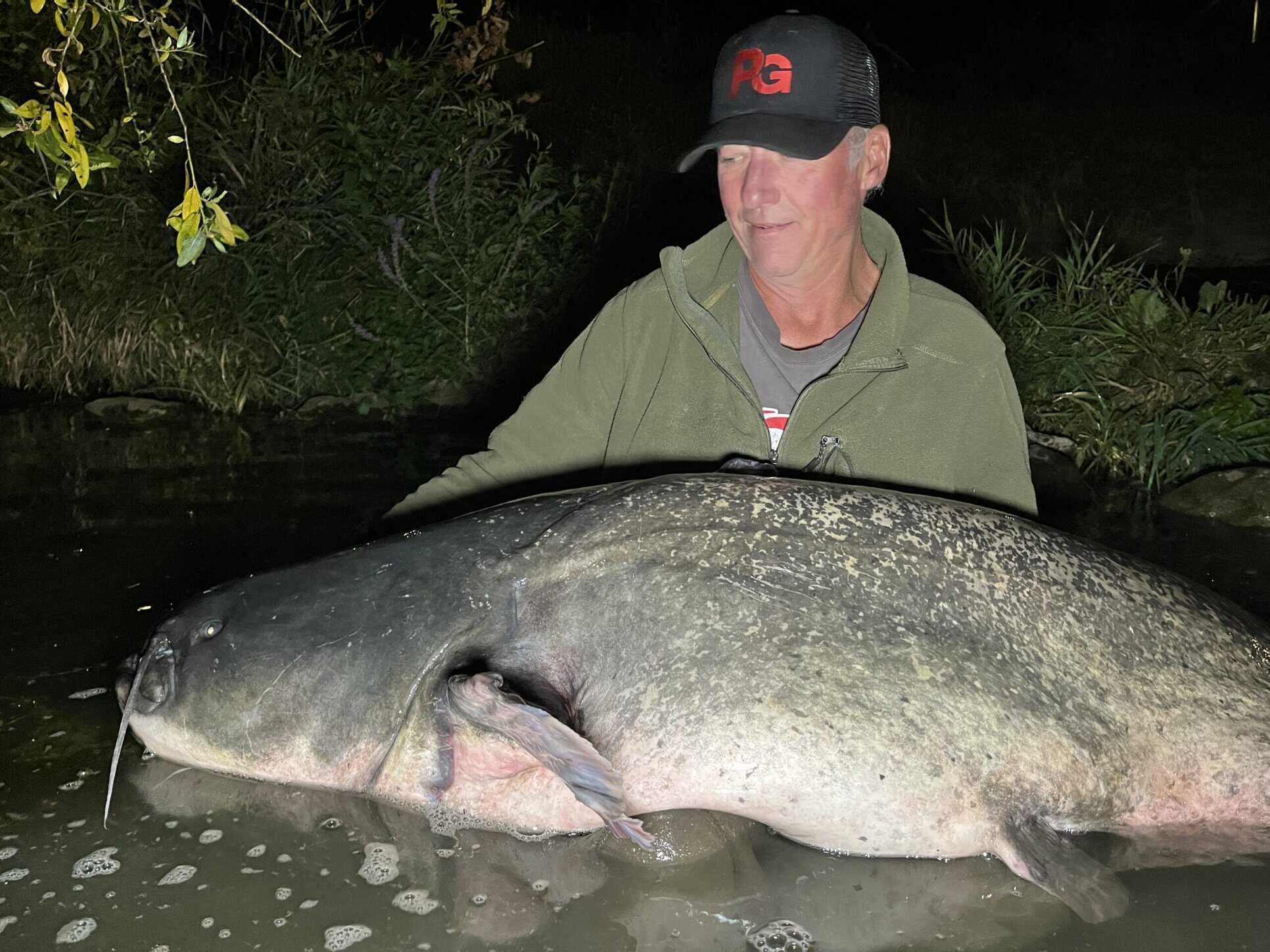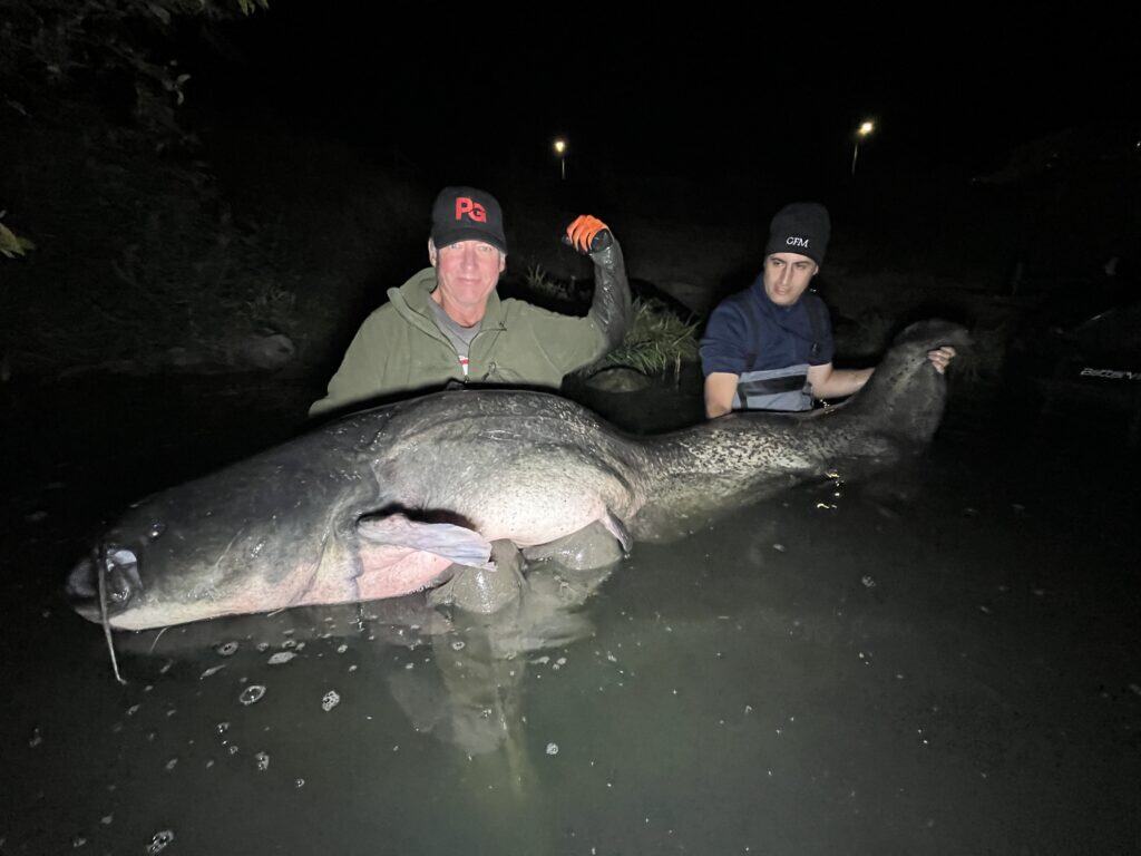 Ondertussen heb ik nog steeds niks te vertellen, ondanks het stevige materiaal waar ik mee vis! Telkens wisselt de vis weer van koers, waarbij hij mij in mijn bellyboat met een ruk om trekt, en ineens trekt de vis een onhoudbare sprint terug richting de structuur! Met twee duimen blokkeer ik de spoel van mijn reel, en met een noodvaart word ik weer op sleeptouw genomen! Het is buigen of barsten, want als de vis de holte weet te bereiken is het einde verhaal! Godzijdank weet ik de vis net op tijd te blokken, en dat is het moment dat ik mezelf realiseer dat ik aan de winnende hand ben! Nu durf ik écht volle bak druk op de vis te zetten, en nadat deze een minuut of 25 lang de kachel met me heeft aangemaakt weet ik deze nu eindelijk hoger in het water te krijgen. Uiteindelijk zie ik in het schijnsel van mijn hoofdlamp een glimp van de kop van het monster, en ik schrik me kapot! Niet alleen vanwege het enorme formaat, maar ook van hoe de vis gehaakt zit! De dreg zit helemaal in het uiterste puntje van de bovenkaak, en ik ben als de dood dat deze alsnog zal gaan losschieten! Ik heb hulp nodig. Nu meteen. Ik roep Mo en vraag hem me te helpen de vis te landen. Ook hij schrikt zich kapot wanneer hij de werkelijk enorme kop ziet, maar meteen hervindt hij zijn kenmerkende ijzige kalmte! Resoluut pakt hij de vis in de bek en hangt deze aan het stringertouw. Met open mond bekijken we alledrie wat een gevaarte er voor ons in het water ligt, en euforisch zoeken we de landingsplek op! Een zeer strakke en correcte meting wijst de bizarre lengte van precies 245 centimeter uit, en ik ben compleet met stomheid geslagen.. In april klapte ik nog mijn handen stuk op het toenmalige Maasrecord van de gebroeders Janssen, en nu ga ik daar nog met een centimeter overheen. Ik kan het gewoon niet geloven!