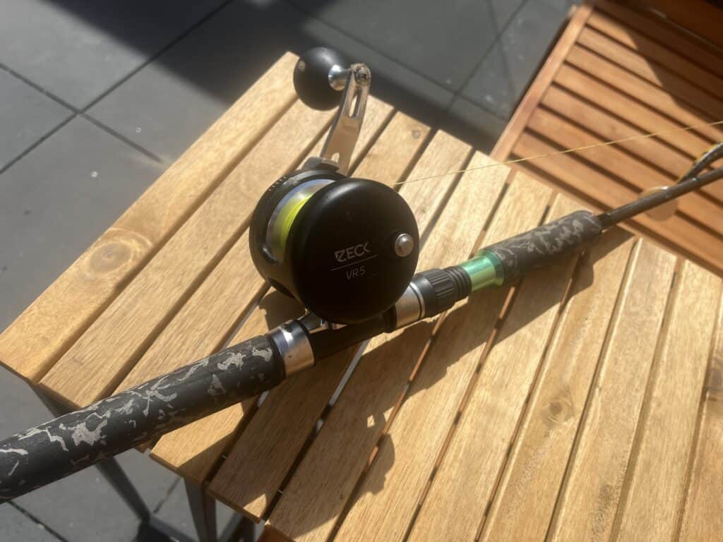 Wanneer ik al draaiend aan mijn transducerstang de structuur af zoek, zie ik onder zo’n holte een werkelijk enorme vis tegen de bodem liggen! Ik breng hem perfect knalrood in beeld, en tel ruim tweeëneenhalf blokje op de Livescope! Wat een monster! Maar ik kan hem in deze positie met mijn kunstaas niet bereiken.. Ik besluit geduldig te wachten. Ik breng mijn shad naar de hoogte van de vis, en blijf rustig liggen, terwijl ik de schoepstaart met rustige halen op en neer beweeg. Dan ineens komt de vis in beweging, en zwemt tergend langzaam richting mijn kunstaas! De aanbeet voelt slechts als een klein tikje, maar in een reflex ram ik de Zeck V-Stick zo krom als een hoepel en zet gelijk volle bak druk! Meteen schreeuw ik naar Mo en Rewien, die iets verderop liggen dat ik mijn nieuwe PR aan de haak heb, en snel komen ze aangevlogen! Ondertussen hang ik met mijn volle gewicht in de hengel, en word compleet door de bizar sterke vis op sleeptouw genomen! Gelukkig zwemt deze weg van de structuur, dus ik heb enorm veel geluk! Maar ik heb werkelijk niks te vertellen met dit ontketende monster onder me! Ondanks dat ik de slip van mijn Zeck VR5 reel aardig dicht heb staan neemt de vis meters lijn, en het geluid van de ratel gaat me door merg en been!