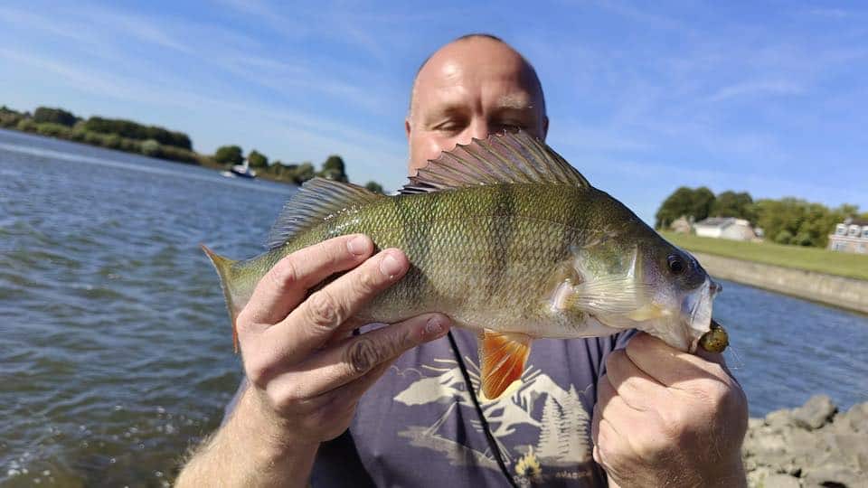 Sander Veenman met een schitterende baars van de rivier! Wat blijven het toch een prachtige, dappere strijders! Beslist één van de mooiste vissen van onze wateren!