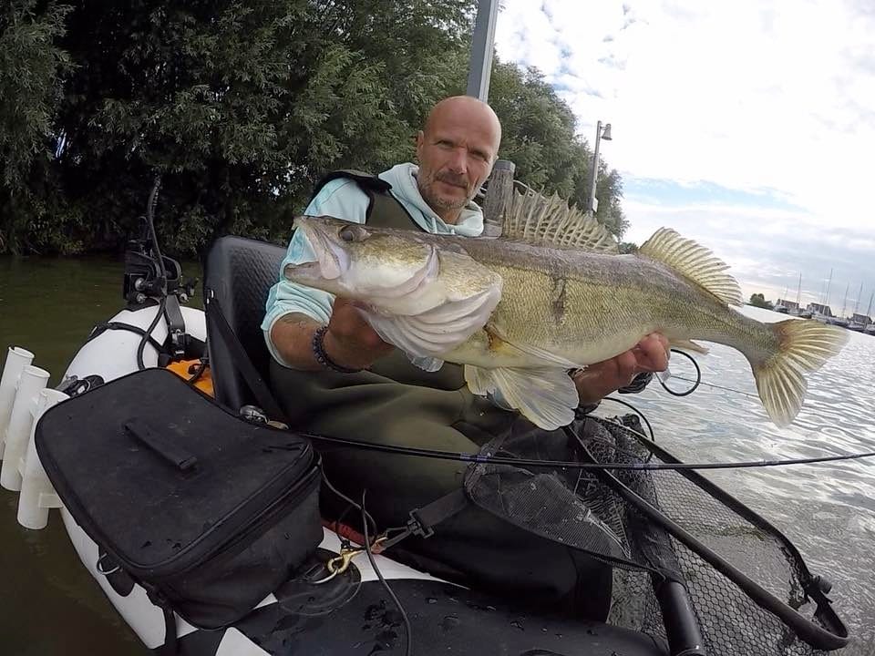 Ulbe Postma met een dikke snoekbaars vanuit de bellyboat! Ik weet hoe verslavend die visserij is, maar heb eerlijk gezegd nog nooit een witte gezien! Mooie vis Ulbe!