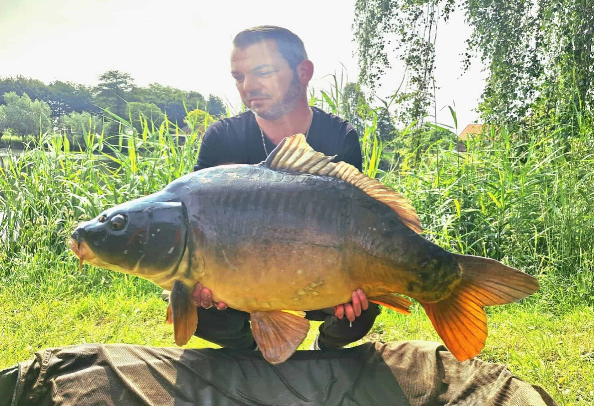 Timo van der Bijl met zo te zien een prachtige legerkarper! Jammer dat de foto iets wazig is, maar evengoed een prachtige vangst! En wat een pens hangt eronder al!