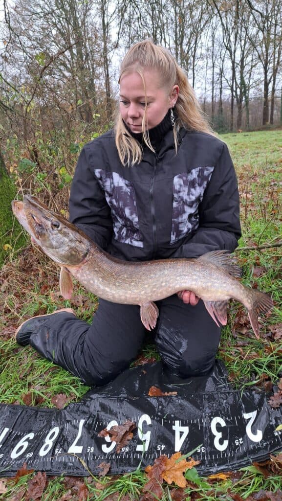 Sharona Jeweett met een prachtige snoek op de mat! De herfst spat letterlijk van deze plaat af met die bladeren op de voorgrond!