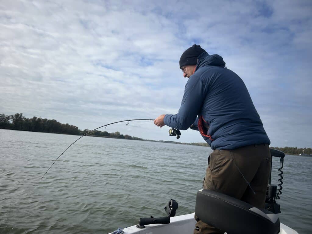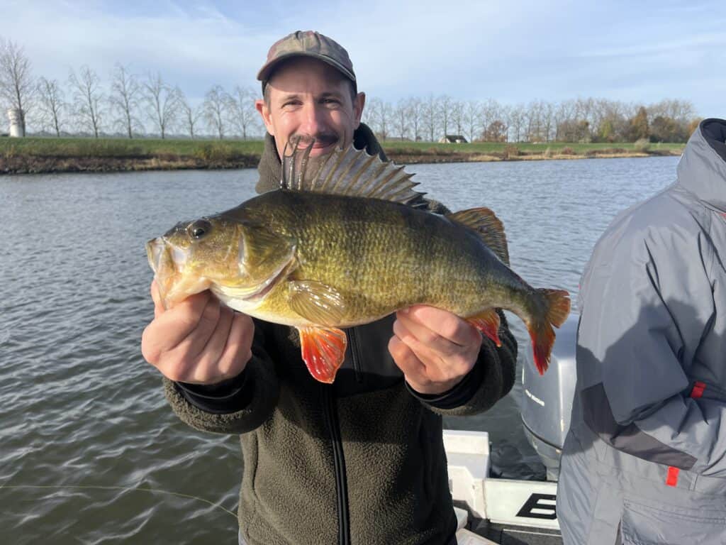 Door de ochtendmist vaar ik de Orka rustig over het bladstille water. Na een winderige week lijkt het nu wel lente, en dat in november! Ons doel is een stek die in deze tijd altijd wel baars oplevert, en de gasten hebben er zin in! Zij hebben me bij hun boeking immers specifiek gevraagd om zoveel mogelijk op baars te vissen. De baarzen van het benedenrivierengebied staan immers door heel Europa bekend als de grootste die er maar te vangen zijn, en de gasten uit Zwitserland willen daar maar al te graag kennis mee maken! Vroeger vingen we die baarzen op deze hotspot meestal al verticalend met shads, maar het nadeel daarvan was dat ze na een aantal driften met de boot over de stek meestal vertrokken waren. Maar de laatste weken gebruik ik een nieuwe techniek, en die legt me geen windeieren! Ik neem je mee in de visserij die de afgelopen periode menig dikke baars aan boord heeft gekregen, zonder ze te verschrikken.