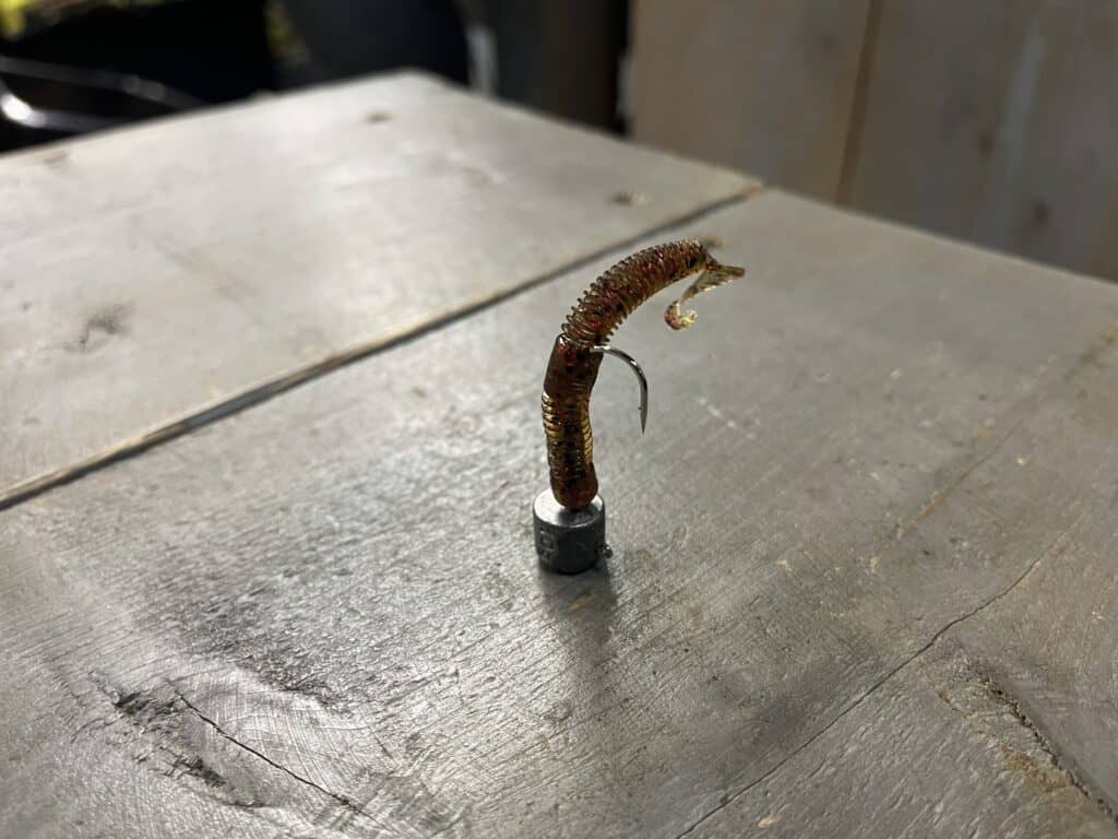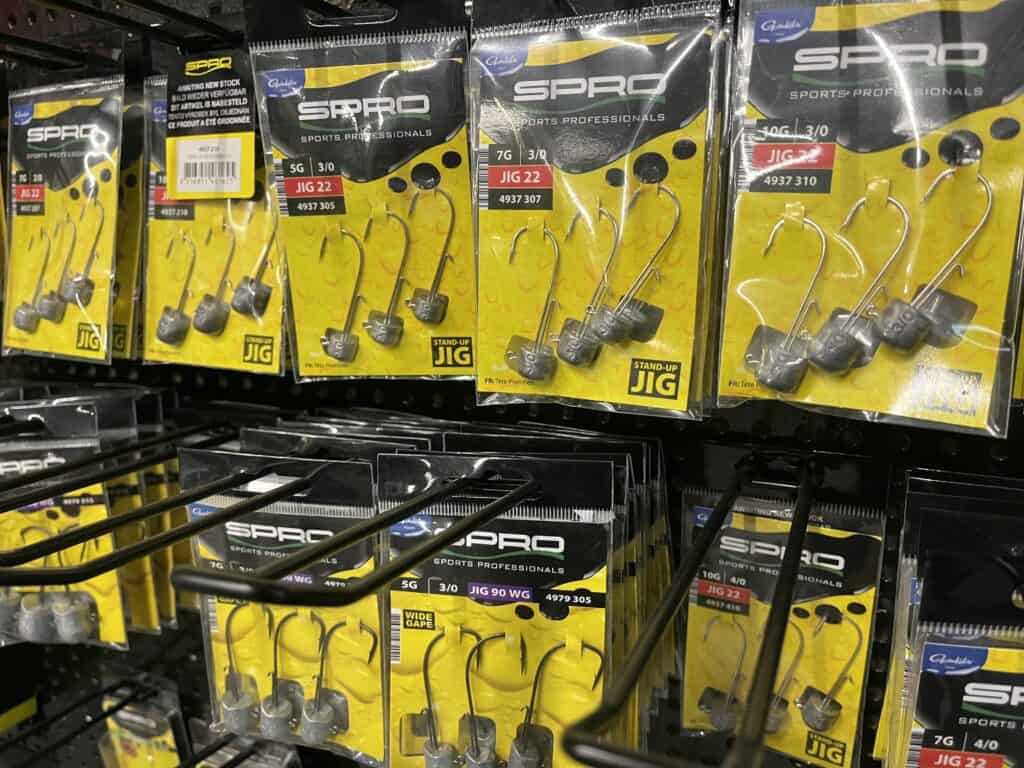 Je wordt tegenwoordig doodgegooid met allerlei speciale ‘finesse’ hengels, en die zijn natuurlijk prima voor dit werk, maar ook met je ‘gewone’ shadhengel kun je hiermee prima uit de voeten. Een werpgewicht van een gram of 25, 2.40 lengte met daarop een molen uit de 2500-serie is perfect. 12/00 gevlochten lijntje erop, en een halve meter 25/00 fluorocarbon of dun staaldraadje als onderlijn, en je bent er. In de handel zijn van alle merken wel Nedrig-kopjes te krijgen, in gewichten van een gram of drie tot zo’n tien gram. Ik gebruik vanwege de stroming in mijn werkgebied meestal die laatste optie overigens. Daarop kun je een kreeftje of een worm monteren, maar ook een gewoon shadje met V- of schoepstaart. De keuze is helemaal aan jou.