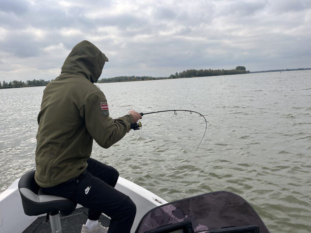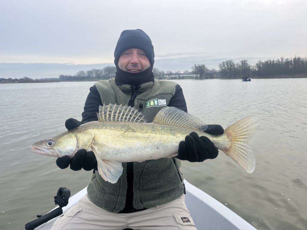 Een eerste idee is dan natuurlijk ‘gewoon’ het werpen met shads op een loodkop. Inwerpen, optikken, indraaien. Dikke prima. Maar daaraan kleeft één nadeel: het gaat allemaal redelijk snel. In de warmere maanden natuurlijk hartstikke goed, maar met een watertemperatuur van negen graden is de vis een stuk trager. Want juist dat is het mooie aan verticalen: je kunt je shad net zo langzaam vissen als je maar wilt. Jij bent immers de ‘poppenspeler’ die precies de actie van het kunstaas onder je bepaalt. Daarom ging ik aan de slag om een alternatief te bedenken, en ineens bedenk ik me dat er ergens in een tacklebox in de boot nog de Nedrig-montages van die laatste Predatortour liggen! Ik knoop ze aan de gastenhengels, en leg de gasten uit wat ze precies moeten doen. Inwerpen, af laten zinken, lijn weer strak draaien en alles gewoon even laten liggen. Vervolgens een half slagje aan de slinger van de molen geven en alles weer even laten liggen. Repeat procedure.. Opeens zie ik een van de gasten zijn hengel krom slaan, en na een mooi gevecht glijdt er een dikke baars in het net! De Nedrig heeft zich tóch weer bewezen, en het zou niet de laatste keer zijn die dag!