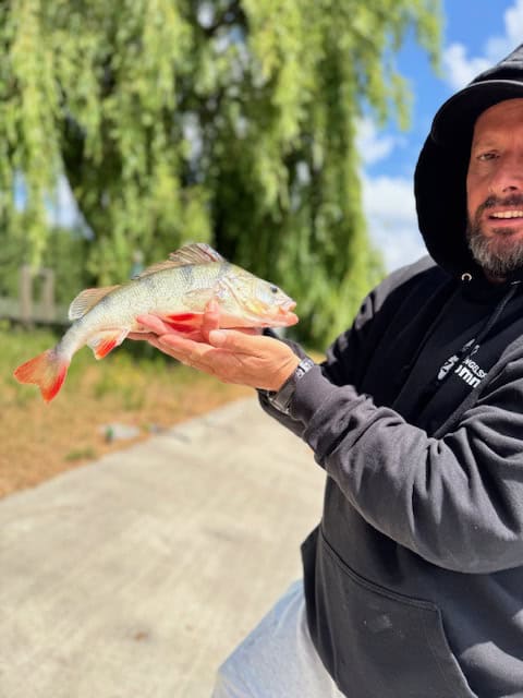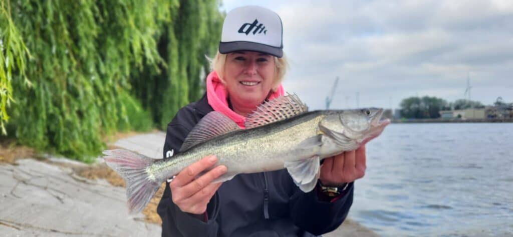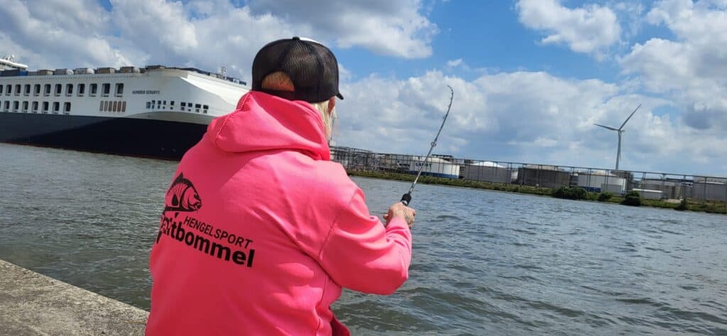 Terwijl we vol concentratie onze worpen uitvissen zien we hier en daar om ons heen de eerste hengels krom gaan, en ook ik krijg ineens een felle tik op de top! Een mooie snoekbaars brengt ons vandaag van de nul af, en daar zou het niet bij blijven! Bizar hoeveel verschil een getij kan uitmaken! Ook William slaat de hengel voor het eerst vandaag krom op een vis, en een prachtige baars is het kortstondige slachtoffer! De aanbeten komen allemaal precies van die eerder genoemde rand onder water af, en ondanks dat we soms een shadje eraan verspelen blijven we die dus bestoken! Er is echt sprake van bijtmomenten. Het ene moment krijgen we een paar aanbeten achter elkaar, dan valt het weer even stil. Vaak vindt er zo’n bijmoment plaats als er een groot schip voorbijkomt dat het water door zijn zuiging in beweging brengt, en dat gebeurt gelukkig om de paar minuten! We zijn inmiddels van de gewone loodkop overgeschakeld naar de Zeck Dart, en dat maakt een verschil! Die gekke actie onder water levert veel meer aanbeten op, zeker nadat we zijn overgeschakeld naar natuurlijke kleuren kunstaas! We krijgen de hele middag dor actie en vangen onszelf lekker in de dubbele cijfers aan baars en snoekbaars. De formaten zijn niet heel indrukwekkend, maar wat is het lekker om weer even lekker te roofvissen! De middag eindigt, en het is helaas weer tijd om naar huis toe te rijden. Maar we hebben beslist geen spijt dat we dit weekend op pad gegaan zijn!