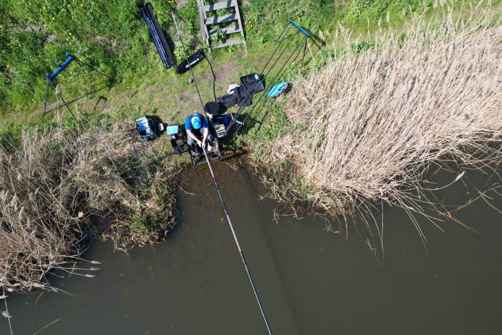 We hebben de stek even met rust gelaten na het aanvoeren om de vis de kans te geven deze te vinden, en nu is het tijd om te starten met vissen. Het vissen met de vaste stok lijkt soms erg passief voor een buitenstaander, maar is dat beslist niet! Jelle houdt continu beweging in zijn presentatie om de vis aan te laten bijten, en dat laatste duurt dan ook niet lang: een kleine voorn brengt ons snel van de nul af, en mag weer vlot gaan zwemmen. Niet de doelsoort waar we vandaag achteraan zitten, maar volgens Jelle is dat vrijwel altijd staande praktijk: eerst komt de kleine vis op de stek, daarna de grote. Weer gaat de dobber onder, en een iets grotere vis komt boven water. Een bliek ditmaal, dus weer een soortje erbij! Ondertussen is Jelle overgeschakeld op de mestpiertjes, en dit levert meteen wat grotere vis op. Het betreft hier een soort die hij als ‘halfwas’ omschrijft, en een beetje het midden houdt tussen een bliek of blei en een brasem. Hiervan volgen er een aantal kort op elkaar. De beet zit er lekker in, en we hebben volle bak actie in een stralend zonnetje! Maar waar blijft de brasem? Jelle slaat weer aan op een aanbeet, en gelijk strekt het topelastiek zich. Daar zul je de eerste hebben! Helaas schiet de vis van de haak, en blijft het even rustig daarna. Jelle was al van de montage van 1.3 gram naar de montage met tweegrams vlagdobber gewisseld, maar doordat de wind nog wat verder is aangetrokken gaat hij nu voor de viergrams-montage met vlagdobber. Hij wil het aas namelijk statisch en zo rustig mogelijk aanbieden om die grote brasems over de streep te trekken. Want we weten nu dat die dikke vissen op de stek zitten!