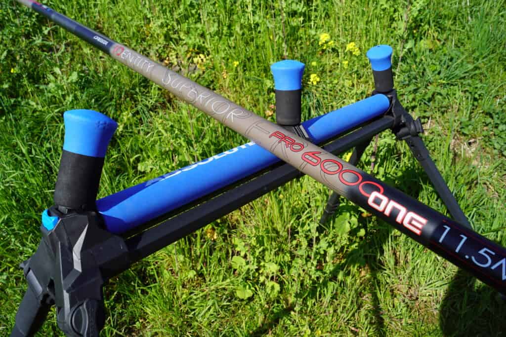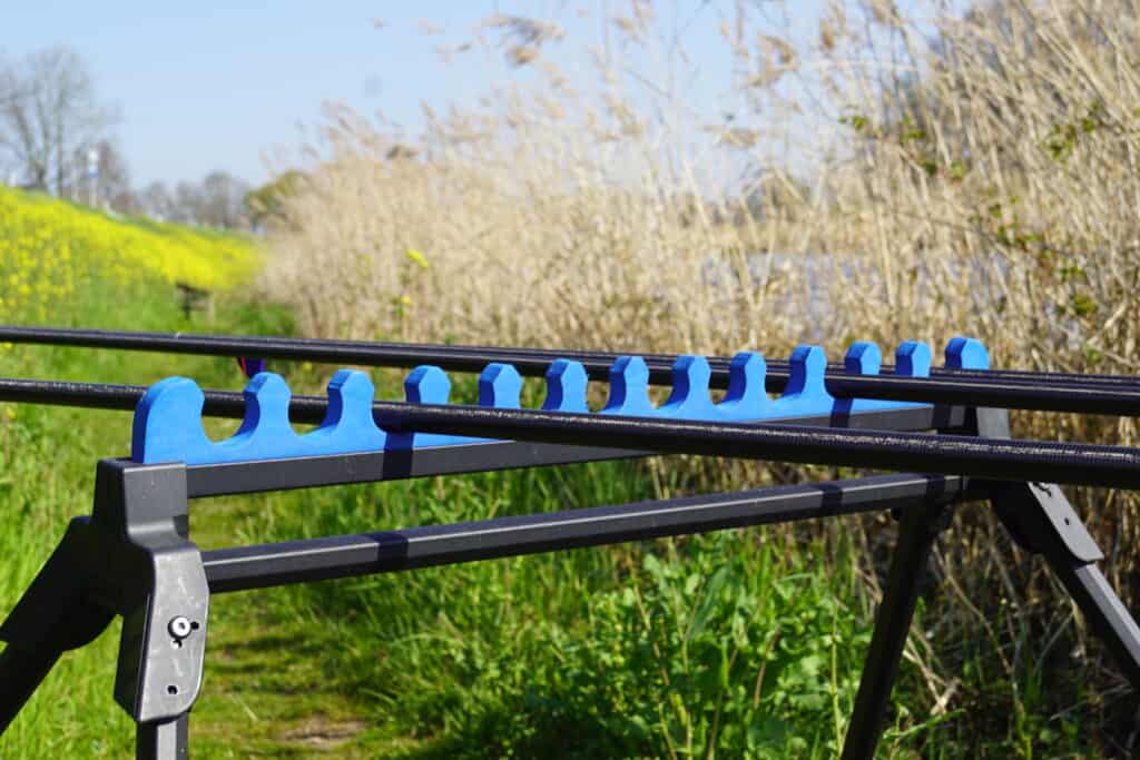 Terwijl ik over de A15 richting onze afspraak rij, belt Jelle me (uiteraard op de carkit): ben je al in de buurt? Ik moet even terug naar huis als je er bent. Ben mijn schepnetsteel vergeten.. Da’s alvast een lekker begin! Wanneer ik aan kom rijden op de locatie, staat de hele santenkraam van Jelle al opgebouwd. Terwijl Jelle huiswaarts rijdt om het toch nogal essentiële onderdeel van de uitrusting op te halen, neem ik alvast foto’s van de materialen die we vandaag gaan gebruiken. Al snel keert Jelle weer terug op de stek, dus we kunnen van start! Jelle zit hier vandaag overigens niet voor niets: over twee weken vindt hier een voorselectiewedstrijd voor het NK dobbervissen plaats, en hij doet daaraan mee. Plaats van handeling is een stuk aan de rivier de Linge bij het dorpje Kedichem. We zitten met de rug pal tegen de hoge rivierdijk aan, dus er moet even worden geïmproviseerd met de afsteekroller: deze wordt iets hoger dan anders gezet, zodat er meer ruimte is om af te steken. Aan de andere kant van de zitkist staat het rek met de vier topdelen, waarvan er eentje wordt gebruikt om voerballen mee te cuppen. De andere drie topdelen zijn opgetuigd. De lichtste is een montage met een gewone dobber van 1.3 gram, waar de andere twee sets met vlagdobbers van respectievelijk twee en vier gram zijn uitgerust. Daarover later meer, want eerst gaan we met het voer aan de slag.