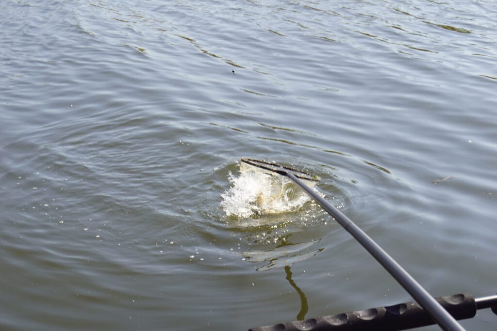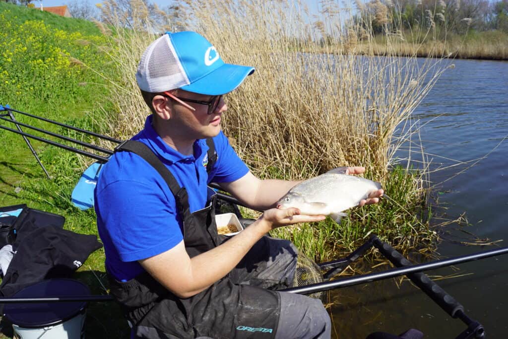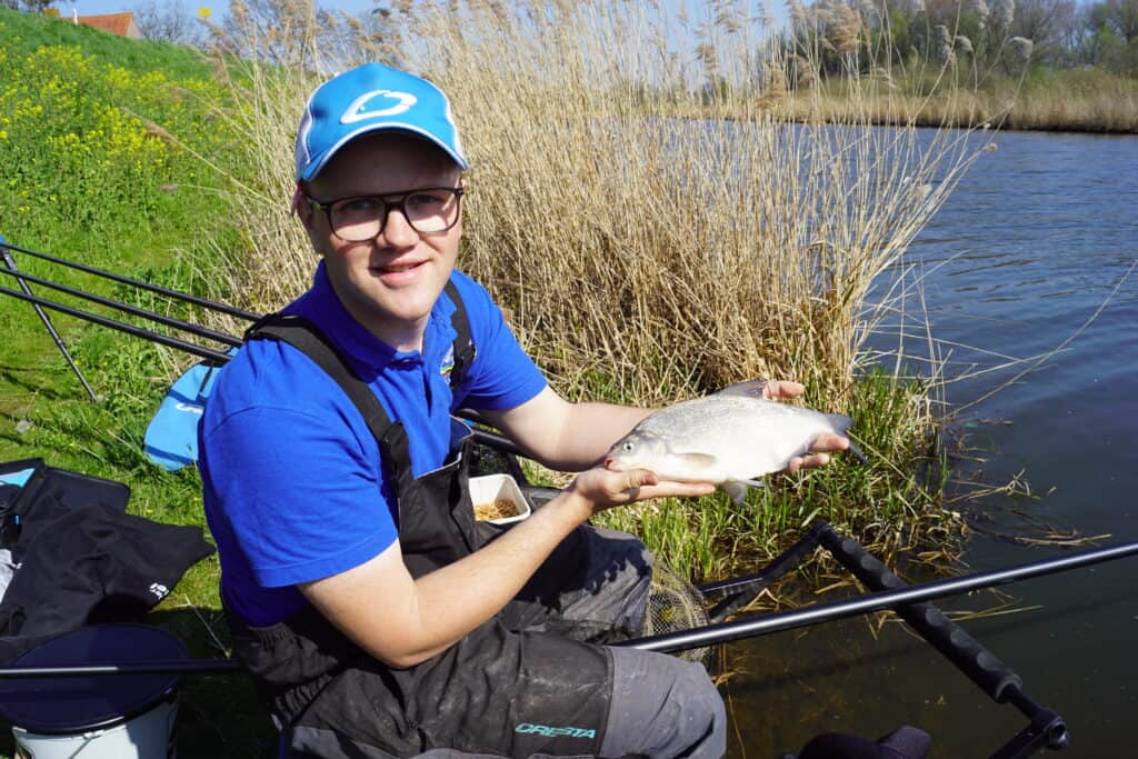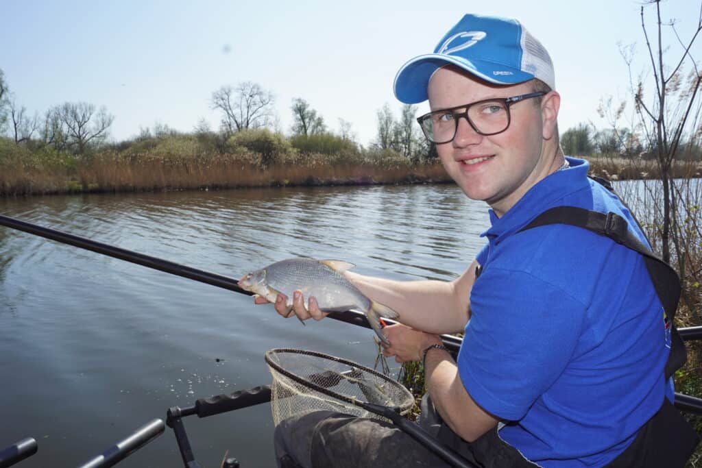 Wanneer je teveel voer op een stek brengt verpest je die, dus Jelle is uiterst voorzichtig met bijvoeren. Een vuistregel is dat hij een balletje voer ter grootte van een mandarijn brengt als hij een kilo-plus vis heeft gevangen, en anders alleen wanneer de beet er echt uitgaat. Dat is nu duidelijk het geval, dus er wordt met de cupset een klein balletje extra voer gebracht. Jelle neemt even pauze, en laat de stek weer even met rust om de vis de kans te geven het voer te vinden. Nadat hij weer is gestart met vissen komt er eerst weer wat klein grut voorbij, want die hebben het nieuwe voer natuurlijk weer als eerste gevonden. Maar dan blijft het even stil. Ineens zakt langzaam de dobber weg, en slaat Jelle aan op iets duidelijk groters! Het topelastiek strekt zich zo’n anderhalve meter uit, en de vis blijft lang diep. Eindelijk wordt de eerste brasem naar het net geleid, maar het zou beslist niet de laatste zijn! Ineens komt plotseling de ene brasem na de andere kortstondig op het droge, en dat laat zien dat de gekozen aanpak gewerkt heeft! Het gericht vissen op grotere witvis vergt een goed plan, maar vooral ook veel geduld.. Want die kleine vis, die is er altijd als de kippen bij.