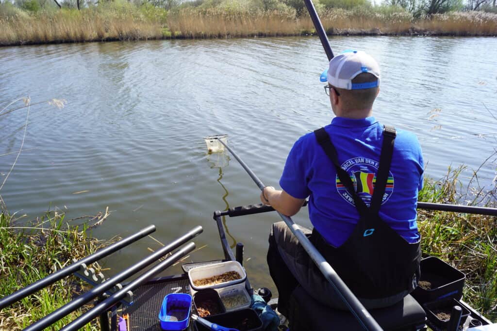 We beginnen met het aanmaken van het voer voor vandaag, en omdat Jelle met name gericht op de -grotere- brasem wil vissen gebruikt hij het Marcel van den Eynde Turbo voer, met daardoor wat Supercrack Bream. Dit veroorzaakt immers mooie wolken onder water, waardoor de vis sneller op het voer wordt geattendeerd. Ook gaat er een handje levende maden doorheen. Van dat voer maakt hij zeven ballen ter grootte van een sinaasappel, en deze worden met de cupset stuk voor stuk op exact dezelfde plek gebracht. Want waar Jelle er elders vaak voor kiest om een dichtbije en een verre stek aan te houden, zet hij hier vol in op één stek op 12,5 meter afstand. De missie is immers grote brasem, en hij vermoedt dat de kans daarop wat verder weg het grootste is. De gebruikte hengel is de Cresta Identity van 12,5 meter, met daarop een 1,2-millimeter topelastiek en een montage van 10/00 nylon. Er wordt altijd gestart met een haakje 18, die nu wordt voorzien van een caster en een dode pinkie. In de aasbakken vinden we ook nog levende maden, dode maden en wormen. tevens heeft Jelle een klein bakje echte mestpiertjes bij zich. Een aas waar momenteel niet heel makkelijk aan te komen is, maar het is hem toch gelukt. Eerder kwamen de vlagdobbers al in beeld, en deze gebruikt hij hier niet voor niets. Niet alleen stroomt de rivier een beetje, maar ook hebben we last van een stevige zijwind. Daar blijft een vlagdobber iets beter op zijn plek dan een conventioneel model. We starten echter eerst met de lichtste montage van 1.3 gram. Deze wordt met een staande haak uitgelood, zodat er superscherp wordt gevist!